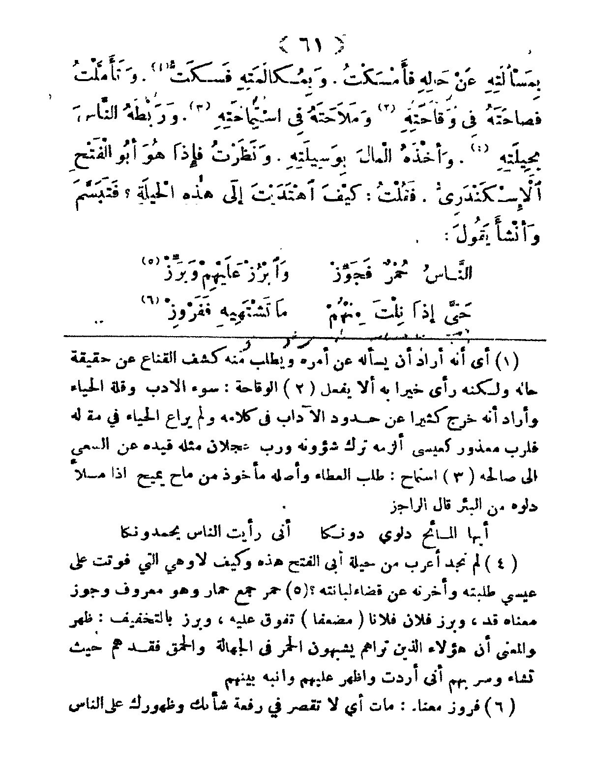 بِمَسْأَلَتِهِ عَنْ حَالِهِ فَأَمْسَكْتُ، وَبِمُكَالَمَتِهِ فَسكَتُّ، وَتَأَمَّلْتُ فَصَاحَتَهُ فِي وَقَاحَتِهِ، وَمَلاحَتَهُ في اسْتِمَاحَتِهِ، وَرَبْطَهُ النَّاسَ بِحيَلتِهِ، وَأَخْذَهُ المَالَ بوَسِيلَتِهِ، وَنَظَرْتُ فإِذَا هُوَ أَبُو الْفَتْحِ الإِسْكَنْدَرِيُّ، فَقُلْتُ: كَيْفَ اهْتَدَيْتَ إِلَى هذِهِ الحِيلَةِ فَتَبَسَّمَ وأَنْشَأَ يَقُولَ: