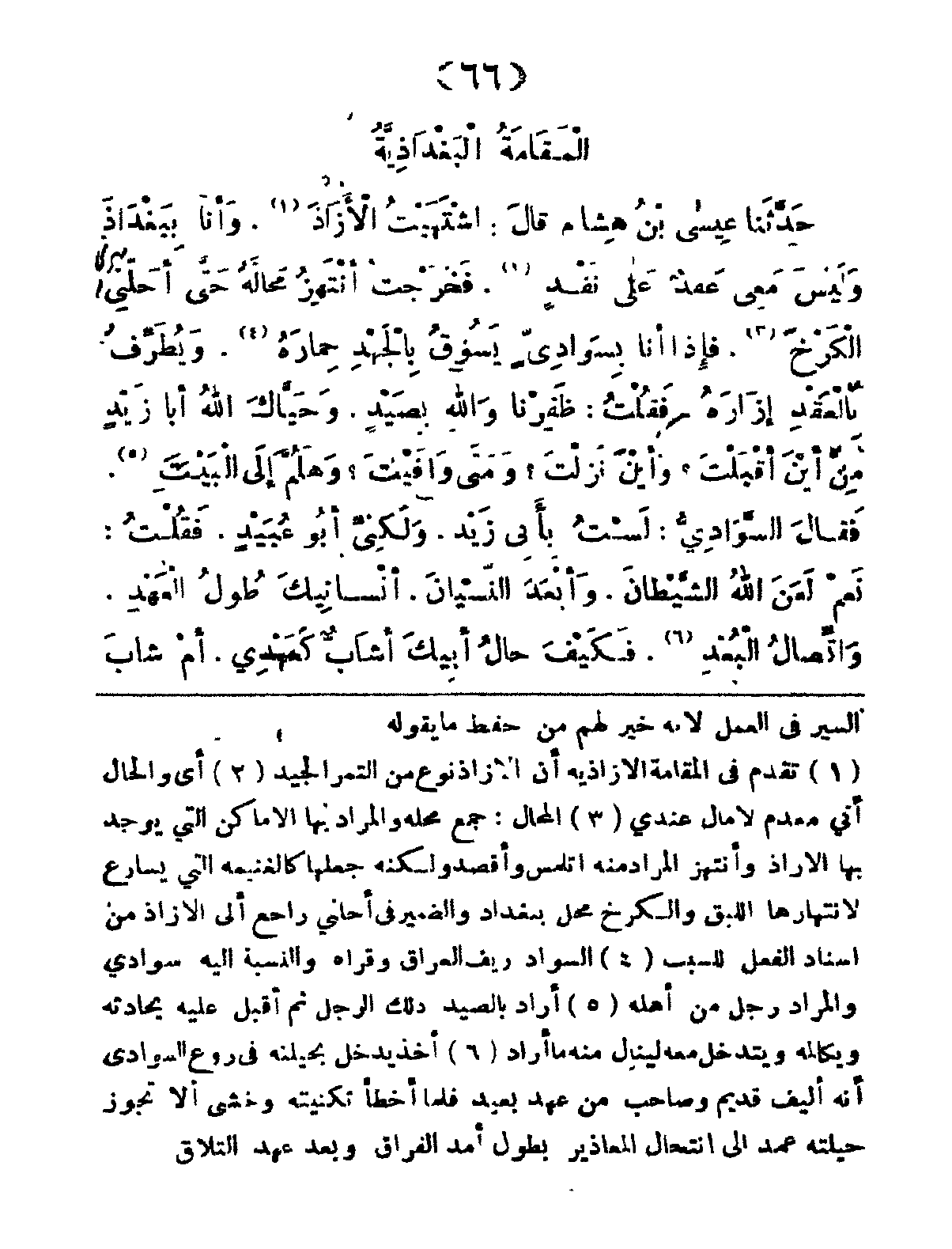 اشْتَهَيْتُ الأَزَاذَ، وأَنَا بِبَغْدَاذَ، وَلَيِسَ مَعْي عَقْدٌ عَلى نَقْدٍ، فَخَرْجْتُ أَنْتَهِزُ مَحَالَّهُ حَتَّى أَحَلَّنِي الكَرْخَ، فَإِذَا أَنَا بِسَوادِيٍّ يَسُوقُ بِالجَهْدِ حِمِارَهُ، وَيَطَرِّفُ بِالعَقْدِ إِزَارَهُ، فَقُلْتُ: ظَفِرْنَا وَاللهِ بِصَيْدٍ، وَحَيَّاكَ اللهُ أَبَا زَيْدٍ، مِنْ أَيْنَ أَقْبَلْتَ؟ وَأَيْنَ نَزَلْتَ؟ وَمَتَى وَافَيْتَ؟ وَهَلُمَّ إِلَى البَيْتِ، فَقَالَ السَّوادِيُّ: لَسْتُ بِأَبِي زَيْدٍ، وَلَكِنِّي أَبْو عُبَيْدٍ، فَقُلْتُ: نَعَمْ، لَعَنَ اللهُ الشَّيطَانَ، وَأَبْعَدَ النِّسْيانَ، أَنْسَانِيكَ طُولُ العَهْدِ، وَاتْصَالُ البُعْدِ، فَكَيْفَ حَالُ أَبِيكَ؟ أَشَابٌ كَعَهْدي، أَمْ شَابَ