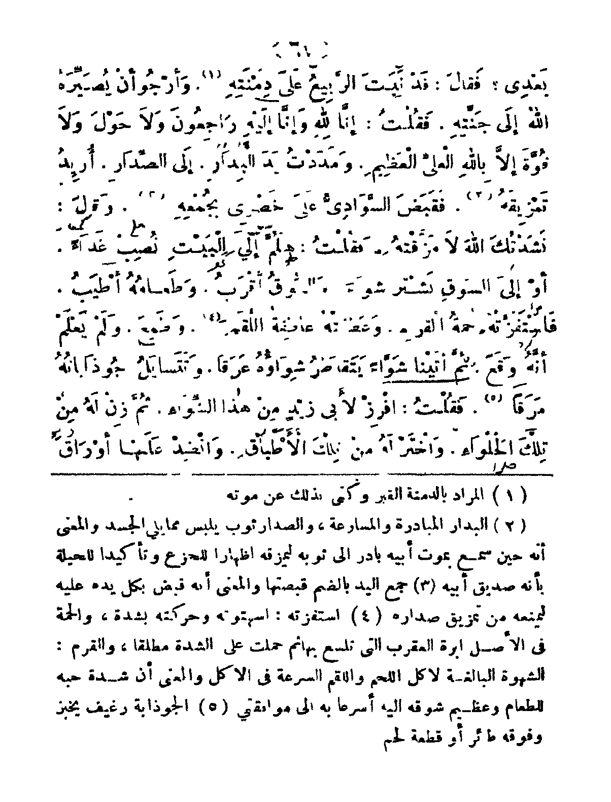 بَعْدِي؟ فَقَالَ: َقدْ نَبَتَ الرَّبِيعُ عَلَى دِمْنَتِهِ، وَأَرْجُو أَنْ يُصَيِّرَهُ اللهُ إِلَى جَنَّتِهِ، فَقُلْتُ: إِنَّا للهِ وإِنَّا إِلَيْهِ رَاجِعُونَ، وَلاَ حَوْلَ ولاَ قُوةَ إِلاَّ بِاللهِ العَلِيِّ العَظِيم، وَمَدَدْتُ يَدَ البِدَارِ، إِلي الصِدَارِ، أُرِيدُ تَمْزِيقَهُ، فَقَبَضَ السَّوادِيُّ عَلى خَصْرِي بِجِمُعْهِ، وَقَالَ: نَشَدْتُكَ اللهَ لا مَزَّقْتَهُ، فَقُلْتُ: هَلُمَّ إِلى البَيْتِ نُصِبْ غَدَاءً، أَوْ إِلَى السُّوقِ نَشْتَرِ شِواءً، وَالسُّوقُ أَقْرَبُ، وَطَعَامُهُ أَطْيَبُ، فَاسْتَفَزَّتْهُ حُمَةُ القَرَمِ، وَعَطَفَتْهُ عَاطِفُةُ اللَّقَمِ، وَطَمِعَ، وَلَمْ يَعْلَمْ أَنَّهُ وَقَعَ، ثُمَّ أَتَيْنَا شَوَّاءً يَتَقَاطَرُ شِوَاؤُهُ عَرَقاً، وَتَتَسَايَلُ جُوذَابَاتُهُ مَرَقاً، فَقُلْتُ: افْرِزْ لأَبِي زَيْدٍ مِنْ هَذا الشِّواءِ، ثُمَّ زِنْ لَهُ مِنْ تِلْكَ الحَلْواءِ، واخْتَرْ لَهُ مِنْ تِلْكَ الأَطْباقِ، وانْضِدْ عَلَيْهَا أَوْرَاقَ