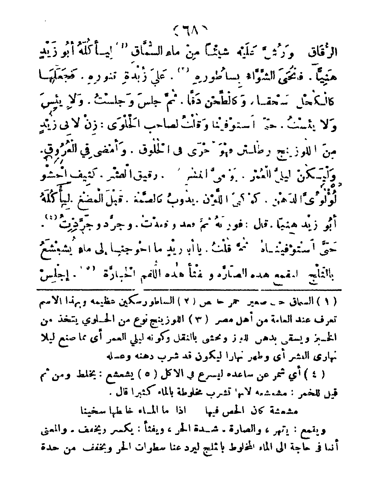 الرُّقَاقِ، وَرُشَّ عَلَيْهِ شَيْئَاً مِنْ مَاءِ السُّمَّاقِ، لِيأَكُلَهُ أَبُو زَيْدٍ هَنيَّاً، فَأنْخّى الشَّواءُ بِسَاطُورِهِ، عَلَى زُبْدَةِ تَنُّورِهِ، فَجَعَلها كَالكَحْلِ سَحْقاً، وَكَالطِّحْنِ دَقْا، ثُمَّ جَلسَ وَجَلَسْتُ، ولا يَئِسَ وَلا يَئِسْتُ، حَتَّى اسْتَوفَيْنَا، وَقُلْتُ لِصَاحِبِ الحَلْوَى: زِنْ لأَبي زَيْدٍ مِنَ اللُّوزِينج رِطْلَيْنِ فَهْوَ أَجْرَى فِي الحُلْوقِ، وَأَمْضَى فِي العُرُوقِ، وَلْيَكُنْ لَيْلَّي العُمْرِ، يَوْمِيَّ النَّشْرِ، رَقِيقَ القِشْرِ، كَثِيفِ الحَشْو، لُؤْلُؤِيَّ الدُّهْنِ، كَوْكَبيَّ اللَّوْنِ، يَذُوبُ كَالصَّمْغِ، قَبْلَ المَضْغِ، لِيَأْكُلَهُ أَبَو َزيْدٍ هَنِيَّاً، قَالَ: فَوَزَنَهُ ثُمَّ قَعَدَ وَقَعدْتُ، وَجَرَّدَ وَجَرَّدْتُ، حَتىَّ اسْتَوْفَيْنَاهُ، ثُمَّ قُلْتُ: يَا أَبَا زَيْدٍ مَا أَحْوَجَنَا إِلَى مَاءٍ يُشَعْشِعُ بِالثَّلْجِ، لِيَقْمَعَ هَذِهِ الصَّارَّةَ، وَيَفْثأَ هذِهِ اللُّقَمَ الحَارَّةَ، اجْلِسْ