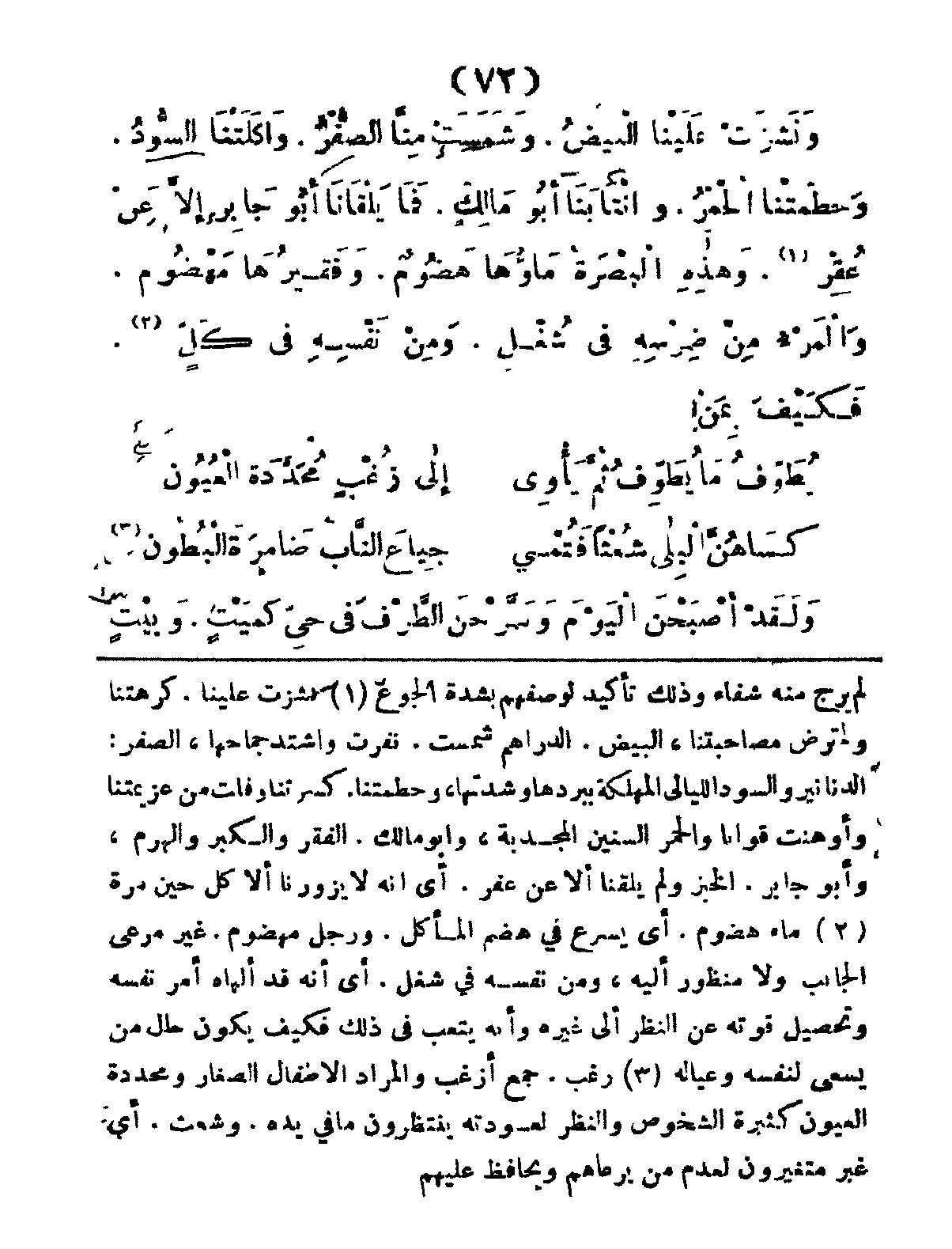 وََنَشَزَتُ عَلَيْنَا البِيضُ، وَشَمَسَتْ مِنَّا الصُّفْرُ، وَأَكَلَتْنَا السُّودُ، وَحَطَّمَتْنَا الحُمْرُ، وَانْتَابَنَا أَبُو مَالِكٍ، فَمَا يَلْقَانَا أَبُو جَابِرٍ إِلاَّ عَنْ عُفْرٍ، وَهَذِهِ البَصْرَةُ مَاؤُهَا هَضُومٌ، وَفَقِيرُهَا مَهْضُومٌ، وَالمَرْءُ مِنْ ضِرْسِهِ فِي شُغْلٍ، وَمِنْ نَفْسِهِ في كَلٍّ، فَكَيْفَ بِمَنْ: