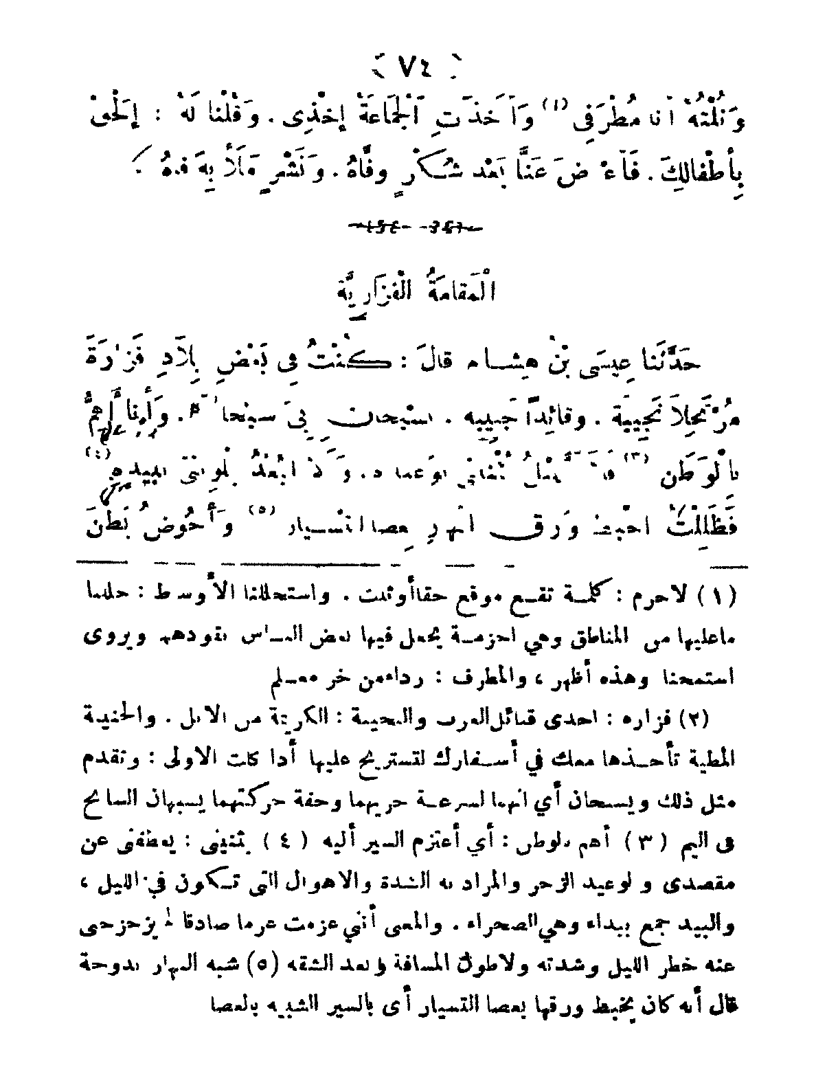 كُنْتُ فِي بَعْضِ بلادِ فَزَارَةَ مُرْتَحِلاً نَجِيبَةً، وَقائِداً جَنِيبَةً، يَسْبَحَانِ بِي سَبْحاً، وَأَنَا أَهِمُّ بِالْوَطَنِ، فَلاَ اللَّيْلُ يَثْنِينِي بِوَعِيدِهِ، وَلاَ البُعْدُ يَلْوِينِي بِبِيدِهِ، فَظَلِلْتُ أَخْبِطُ وَرَقَ النَّهَارِ، بِعَصَا التَّسْيَار وَأَخُوضُ بَطْنَ