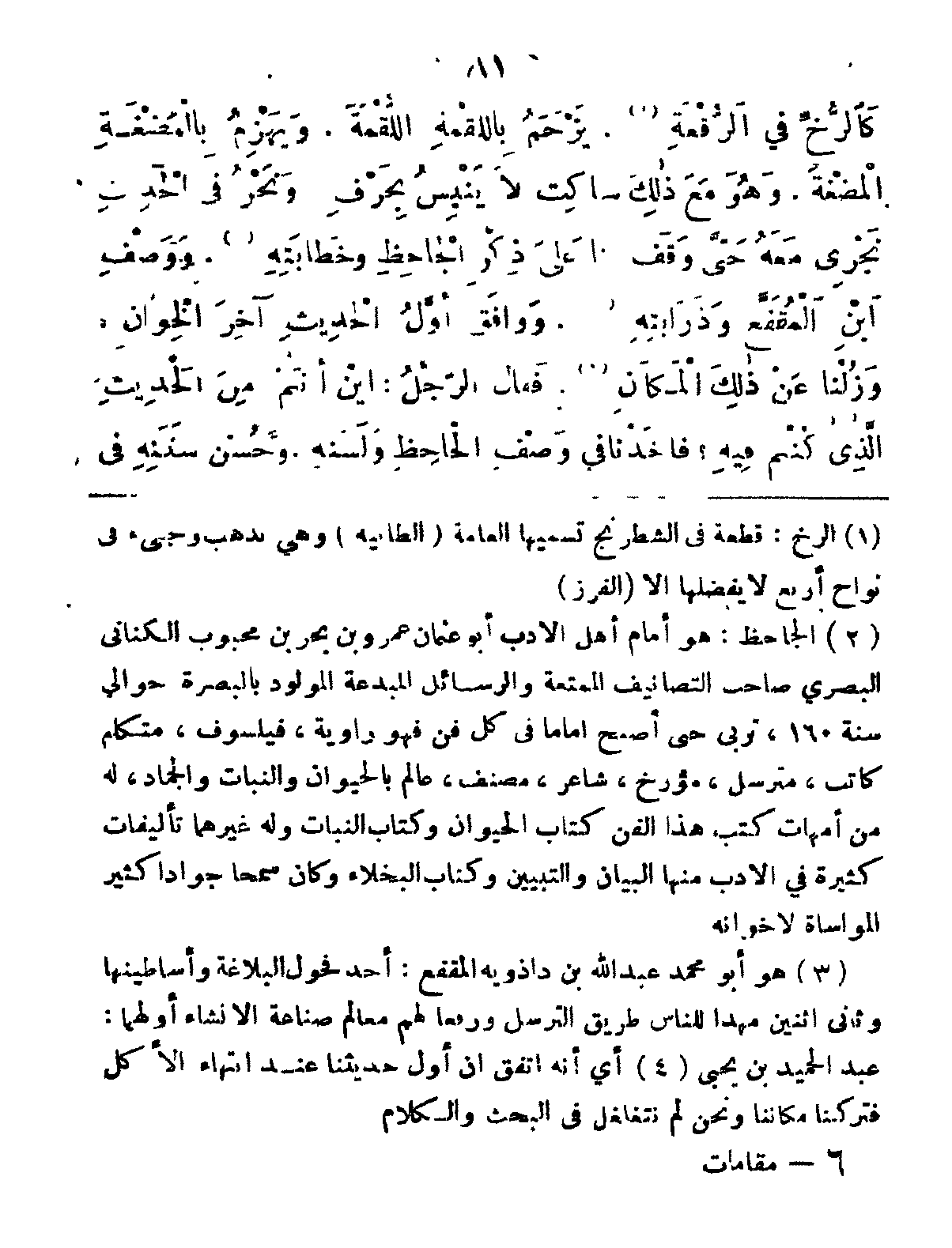 كَالرُّخِّ في الرُّقْعَةِ، يَزْحَمُ باِللُّقْمَةِ اللُّقْمَةَ، وَيَهْزِمُ بِالمَضْغَةِ المْضغَة، وَهْوَ مَعَ ذَلِكَ ساكِتٌ لاَ يَنْبِسُ بِحًرفٍ، وَنَحْنُ فِي الحَدِيثِ نَجْري مَعْهُ، حَتَّى وَقَفَ بِنَا عَلَى ذِكْرِ الجاحِظِ وَخَطابَتِهِ، وَوَصْفِ ابْنِ المُقَفّعِ وَذَرَابتِهِ، وَوَافَقَ أَوَّلُ الحَدِيثَ آخِرَ الخِوَانِ، وَزُلْنَا عَنْ ذَلِكَ المَكانِ، فَقَالَ الرَّجُلُ: أَيْنَ أَنْتُمْ مِنَ الحَدِيثِ الَّذِي كُنْتُمْ فيِهِ؟ فَأَخَذْنَا فِي وَصْفِ الجَاحِظِ ولَسَنِهِ، وَحُسْنِ سَنَنِهِ فِي