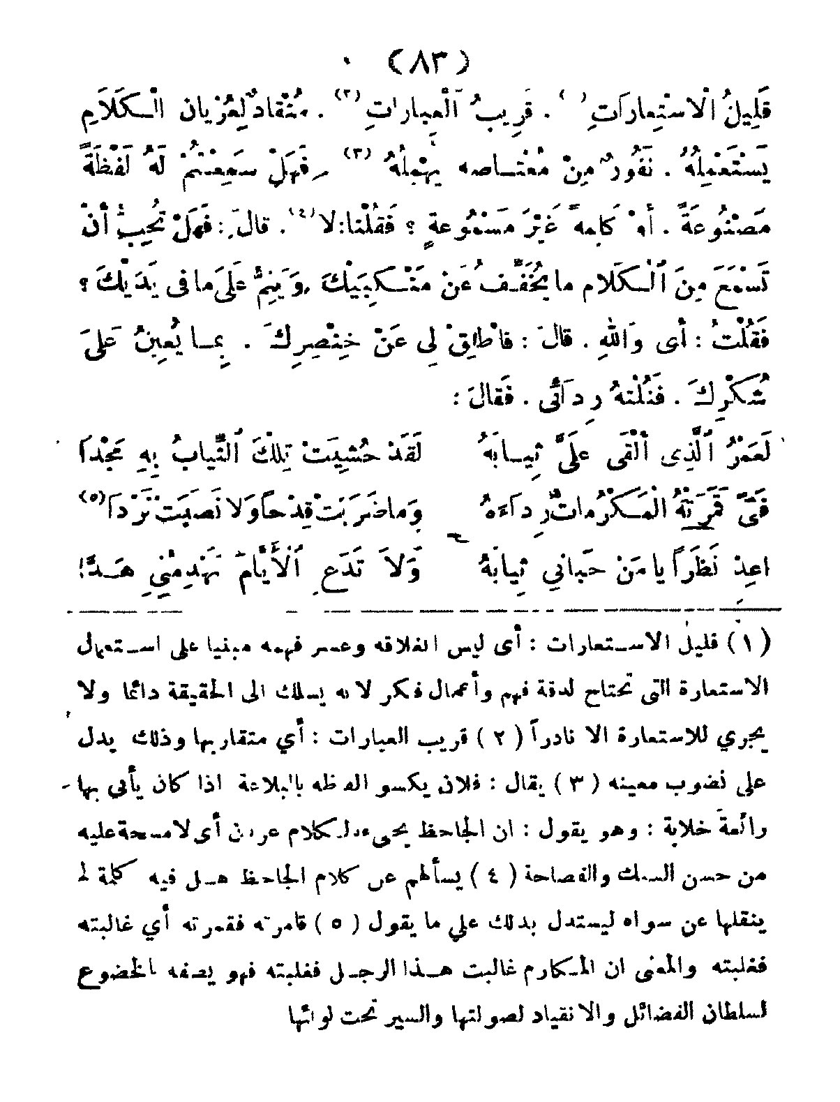 قَلِيلُ الاسْتِعَاراتِ، قَرِيبُ العِبَارَات، مُنْقادٌ لعُرْيَانِ الكَلاَمِ يسْتَعْمِلُهُ، نَفُورٌ مِنْ مُعْتَاصِهِ يُهْمِلُهُ، فَهَلْ سَمِعْتُمْ لَهُ لَفْظَةً مَصْنُوعَةً، أَوْ كَلِمَةً غَيْرَ مَسْمُوعَةٍ؟ فَقُلْنَا: لاَ، فَقَالَ: هَلْ تُحِبُّ أَنْ َتسْمَعَ مِنَ الكَلاَمِ مَا يُخَفِّفُ عَنْ مَنْكِبَيْكَ، وَيَنِمُّ علَى مَا في يَدَيْكَ؟ فَقُلْتُ: إِي وَاللهِ، قَالَ: فأَطْلِقْ لِي عَنْ خِنْصِرِكَ، بِمَا يُعِينُ على شُكْرِكَ، فَنُلْتُهُ رِدَائِي، فَقالَ: