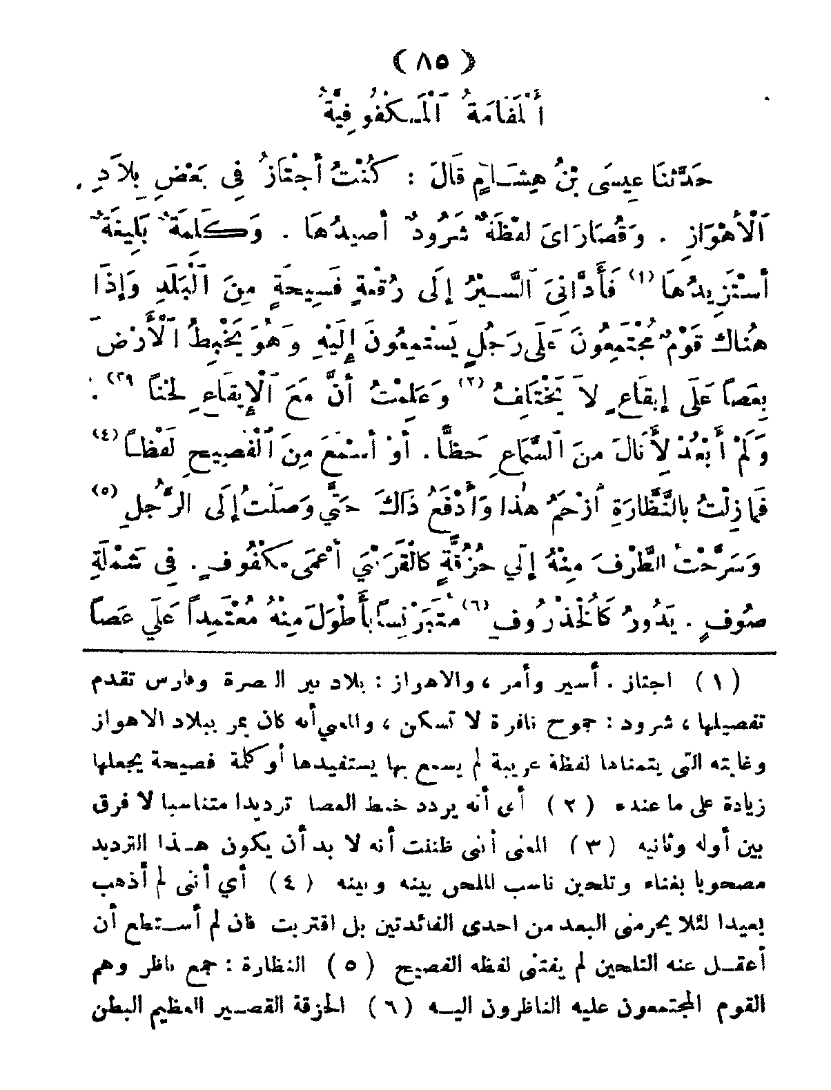 كُنْتُ أَجْتَازُ، فِي بَعْضِ بِلاَدِ الأَهْوَازِ، وَقُصَارَايَ لَفْظَةٌ شَرُودٌ أَصِيدُهَا، وَكَلِمَةٌ بَلِيَغٌة أَسْتَزِيدُهَا، فَأَدَّانِي السَّيْرُ إِلَى رُقْعَةٍ فَسِيحَةٍ مِنَ البَلَدِ، وَإِذَا هُنَاكَ قَوْمٌ مُجْتَمِعُونَ عَلى رَجُلٍ يَسْتَمِعُونَ إِلَيْهِ، وَهُوَ يَخْبِطُ الأَرْضَ بعصاً على إِيقَاعٍ لاَ يَخْتَلِفُ، وَعَلِمْتُ أَنَّ مَعَ الإِيقَاعِ لَحْناً، وَلَمْ أَبْعُدْ لأَنَالَ مِنَ السَّمَاعِ حَظًّاً، أَوْ أَسْمَعَ مِنَ الفَصِيحِ لَفْظاً، فَمَا زِلْتُ بالنَّظَّارَةِ أَزْحَمُ هَذا وَأَدْفَعُ ذَاكَ حَتَّى وَصَلْتُ إِلى الرَّجُلِ، وَسَرَّحْتُ الطَّرْفَ مِنْهُ إِلَى حُزُقَّةٍ كَالَقَرَنْبَي أَعمى مَكْفُوفٍ، فِي شَمْلَةِ صُوفٍ، يَدُورُ كَالخُذْرُوفِ، مُتَبَرْنِساً بِأَطْوَلَ مِنْهُ، مُعْتَمِداً على عَصاً