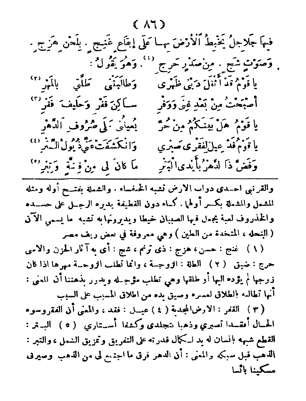 فِيهَا جَلاَجِلُ يَخْبِطُ الأَرْضَ بِهَا عَلى إِيقَاعٍ غَنِجٍ، بِلَحْنٍ هَزِجٍ، وَصَوْتٍ شَجٍ، مِنْ صَدْرٍ حَرِجٍ، وَهْوَ يَقُولُ: