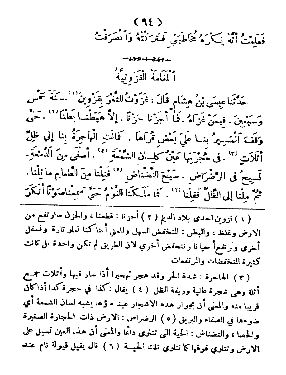 غَزَوْتُ الثَّغْرَ بِقَزْوِينَ، سَنَةَ خَمْسٍ وَسَبْعِينَ، فِيَمْن غَزَاهُ، فَما أَجَزْنَا حَزْناً، إِلاَّ هَبَطْنَا بَطْناً، حَتَّى وَقَفَ المَسِيُر بِنَا عَلَى بَعْضِ قُرَاهَا، فَمَالتِ الهَاجِرَةُ بِنَا إِلى ظِلَّ أَثَلاثٍ، في حُجْرتَهِا عَيْنٌ كَلِسَانِ الشَّمْعَةِ، أَصْفَى مِنَ الدَّمْعَةِ، تَسِيحُ فِي الرَّضْرَاضِ سَيْحَ النَّضْنَاضِ، فَنِلْنَا مِنَ الطَّعَامِ مَا نِلْنَا، ثُمَّ مِلْنَا إِلى الظِّلِّ فَقِلْنَا، فَمَا مَلَكَنَا النَّوْمُ حَتَّى سَمِعْنَا صَوْتاً أَنْكَرَ