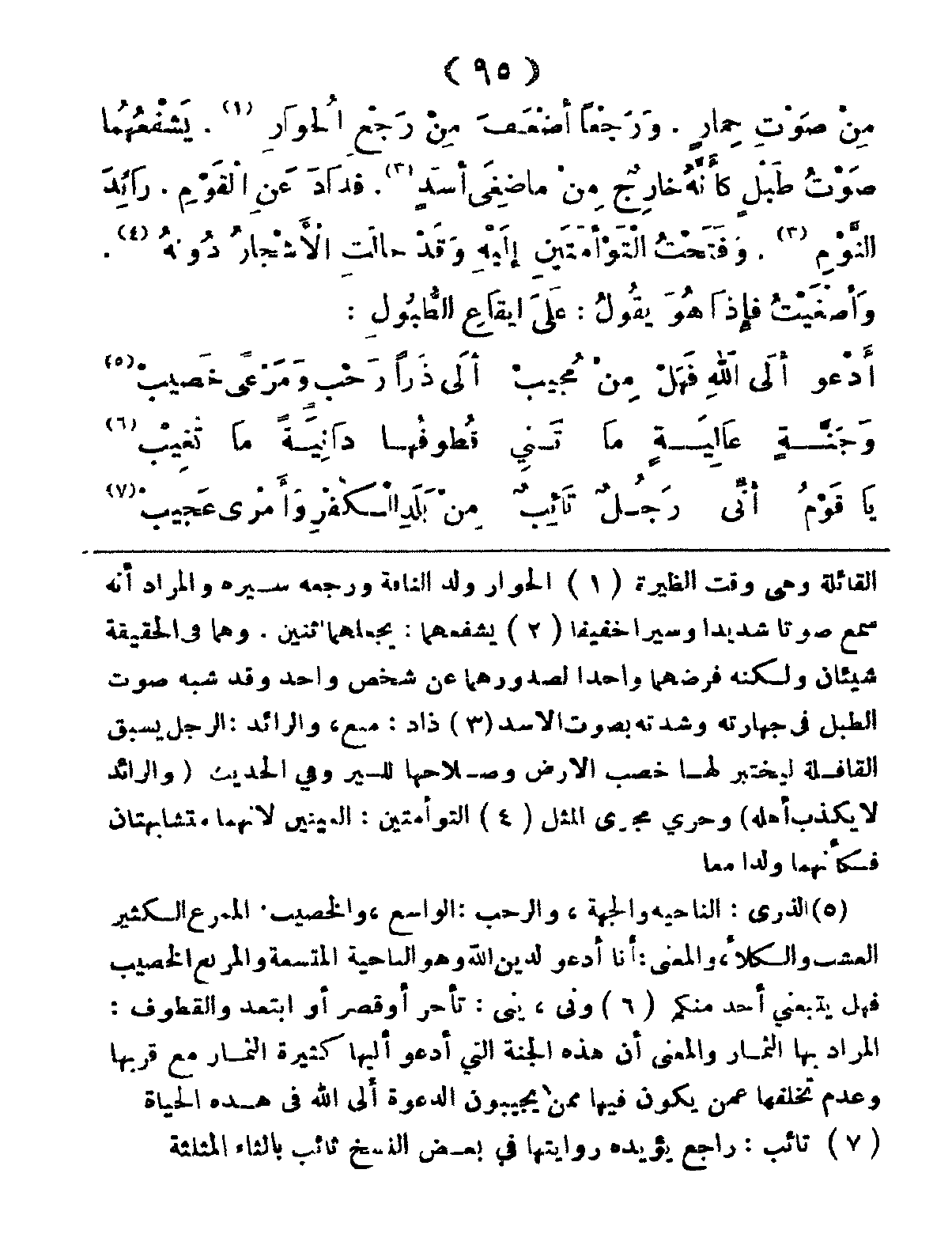 مِنْ صَوْتِ حِمَارٍ، وَرَجْعاً أَضْعَفَ مِنْ رَجْعِ الحُوَارِ، يَشْفَعُهُمَا صَوْتُ طَبْلٍ كَأَنَّهُ خَاِرٌج مِنْ ما ضِغَيْ أَسَدٍ، فَذَادَ عَنِ القَومِ، رَائِدَ النَّوْمِ، وَفَتَحْتُ التَّوْأَمَتَيْنِ إِلَيْهِ وَقَدْ حَالَتِ الأَشْجَارُ دُونَهُ، وَأَصْغَيْتُ فَإِذَا هُوَ يَقُولُ، عَلى إِيَقاعِ الطُّبُولِ: