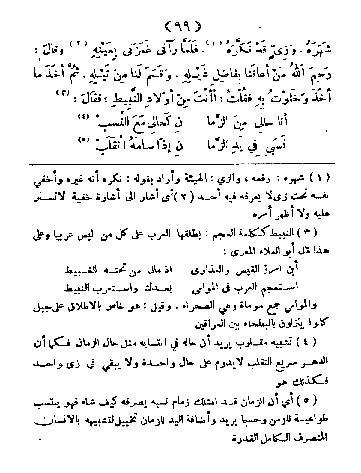 شَهَرَهُ، وَزِيّ قّدْ نَكَّرَهُ، فَلَمَّا رآنِي غَمَزَنِي بِعَيْنِهِ، وَقَالَ: رَحِمَ اللهُ مَنْ أَعَانَنَا بِفَاضِلَ ذَيْلَهِ، وَقَسَمَ لنَا مِنْ نَيْلهِ، ثُمَّ أَخَذَ مَا أَخَذَ، وَخَلْوتُ بِهِ فَقُلْتُ: أَأَنْتَ مِنْ أَوْلادِ النَّبِيطِ؟ فَقَالَ: