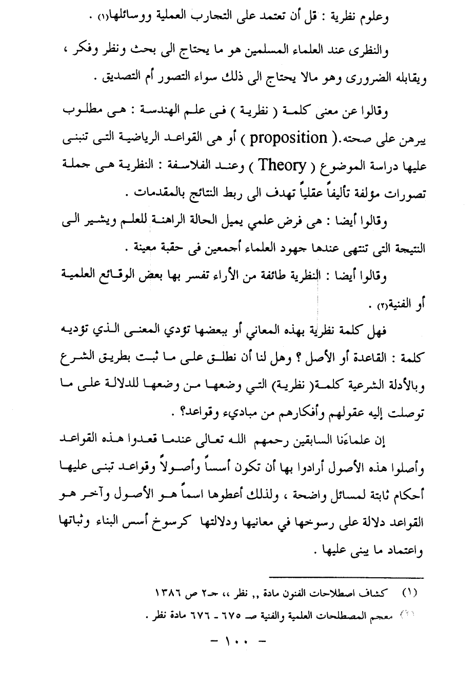 فهل كلمة نظرية بهذه المعاني أو ببعضها تؤدي المعنى الذي تؤديه كلمة: القاعدة أو الأصل؟ وهل لنا أن نطلق على ما ثبت بطريق الشرع وبالأدلة الشرعية كلمة (نظرية) التي وضعها من وضعها للدلالة على ما توصلت إليه عقولهم وأفكارهم من مبادئ وقواعد؟.