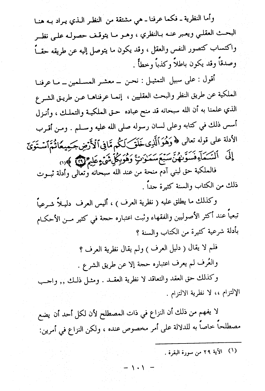 أقول: على سبيل التمثيل: نحن - معشر المسلمين - ما عرفنا الملكية عن طريق النظر والبحث العقليين، إنما عرفناها عن طريق الشرع الذي علمنا به أن الله سبحانه قد منح عباده حق الملكية والتملك، وأنزل أسس ذلك في كتابه وعلى لسان رسوله صلى الله عليه وسلم. ومن أقرب الأدلة على قوله تعالى {هُوَ الَّذِي خَلَقَ لَكُمْ مَا فِي الْأَرْضِ جَمِيعًا ثُمَّ اسْتَوَى إِلَى السَّمَاءِ فَسَوَّاهُنَّ سَبْعَ سَمَاوَاتٍ وَهُوَ بِكُلِّ شَيْءٍ عَلِيمٌ (29)} (¬1)