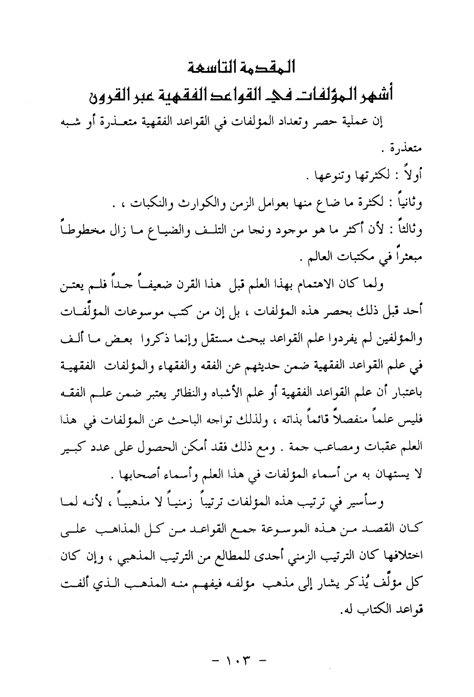 وسأسير في ترتيب هذه المؤلفات ترتيباً زمنياً لا مذهبياً، لأنه لما كان القصد من هذه الموسوعة جمع القواعد من كل المذاهب على اختلافها كان الترتيب الزمني أجدى للمطالع من الترتيب المذهبي، وإن كان كل مؤلّف يُذكر يشار إلى مذهب مؤلفه فيفهم منه المذهب الذي ألفت قواعد الكتاب له.