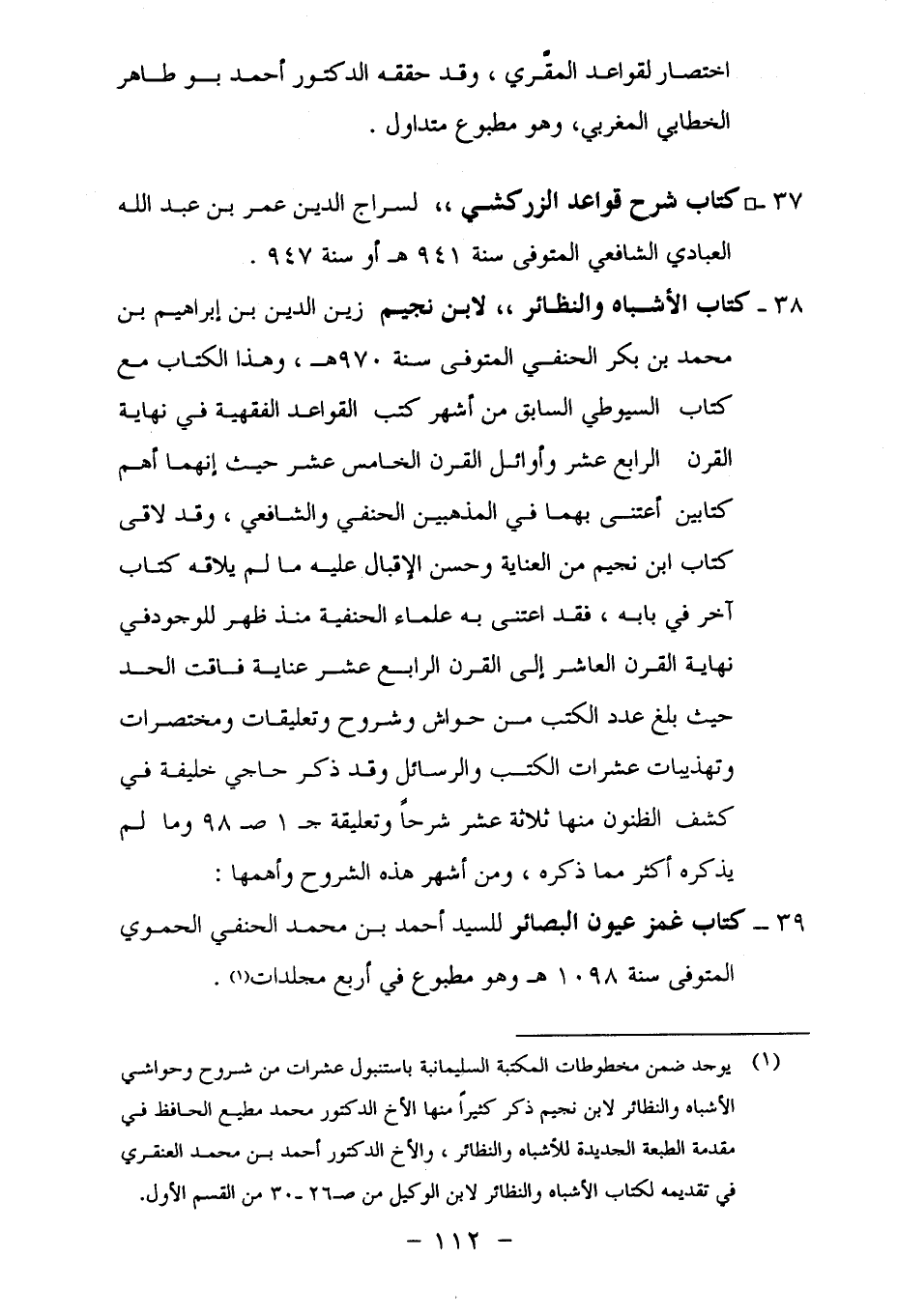 38 - كتاب الأشباه والنظائر" لابن نجيم زين الدين بن إبراهيم بن محمد بن بكر الحنفي المتوفى سنة 970 هـ، وهذا الكتاب مع كتاب السيوطي السابق من أشهر كتب القواعد الفقهية في نهاية القرن الرابع عشر وأوائل القرن الخامس عشر حيث إنهما أهم كتابين أعتنى بهما في المذهبين الحنفي والشافعي، وقد لاقى كتاب ابن نجيم من العناية وحسن الإقبال عليه ما لم يلاقه كتاب آخر في بابه، فقد اعتنى به علماء الحنفية منذ ظهر للوجود في نهاية القرن العاشر إلى القرن الرابع عشر عناية فاقت الحد حيث بلغ عدد الكتب من حواش وشروح وتعليقات ومختصرات وتهذيبات عشرات الكتب والرسائل وقد ذكر حاجي خليفة في كشف الظنون منها ثلاثة عشر شرحاً وتعليقة جـ 1 صـ 98 وما لم يذكره أكثر مما ذكره، ومن أشهر هذه الشروح وأهمها:
