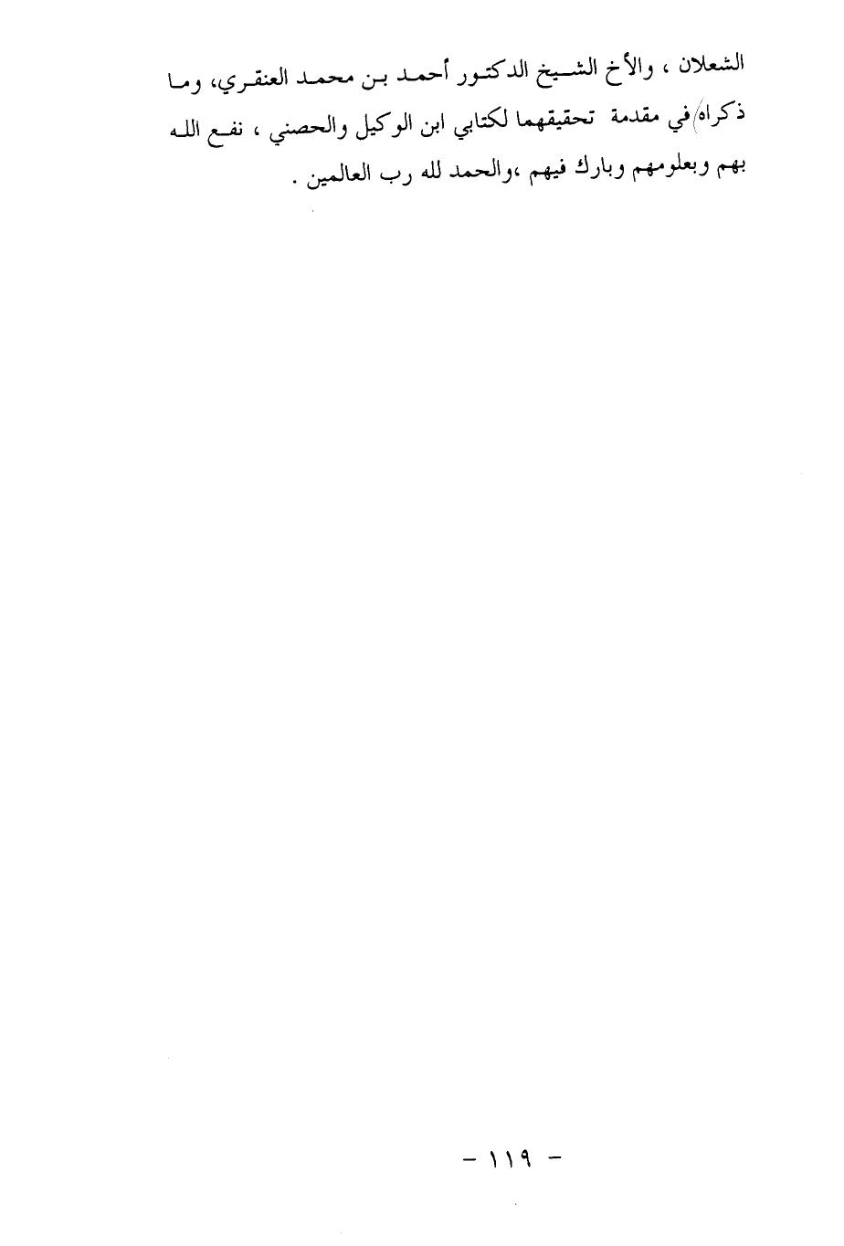 الشعلان، والأخ الشيخ الدكتور أحمد بن محمد العنقري، وما ذكراه في مقدمة تحقيقهما لكتابي ابن الوكيل والحصني، نفع الله بهم وبعلومهم وبارك فيهم، والحمد لله رب العالمين.