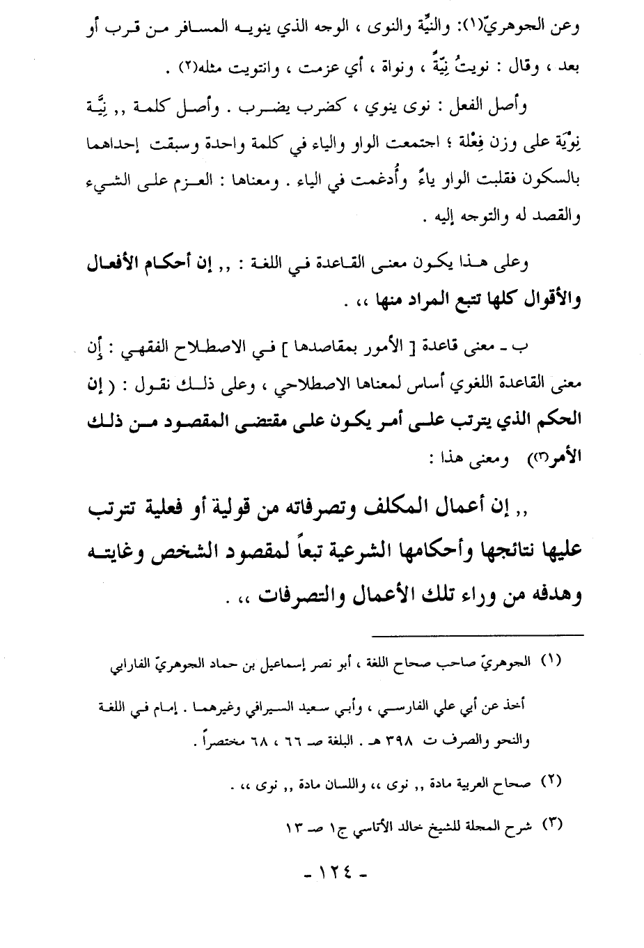 "إن أعمال المكلف وتصرفاته من قولية أو فعلية تترتب عليها نتائجها وأحكامها الشرعية تبعاً لمقصود الشخص وغايته وهدفه من وراء تلك الأعمال والتصرفات".