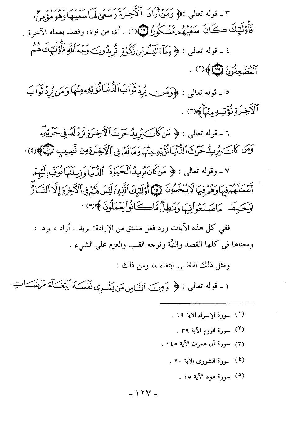 ففي كل هذه الآيات ورد فعل مشتق من الإرادة: يريد، أراد، يرد، ومعناها في كلها القصد والنيَّة وتوجه القلب والعزم على الشيء.