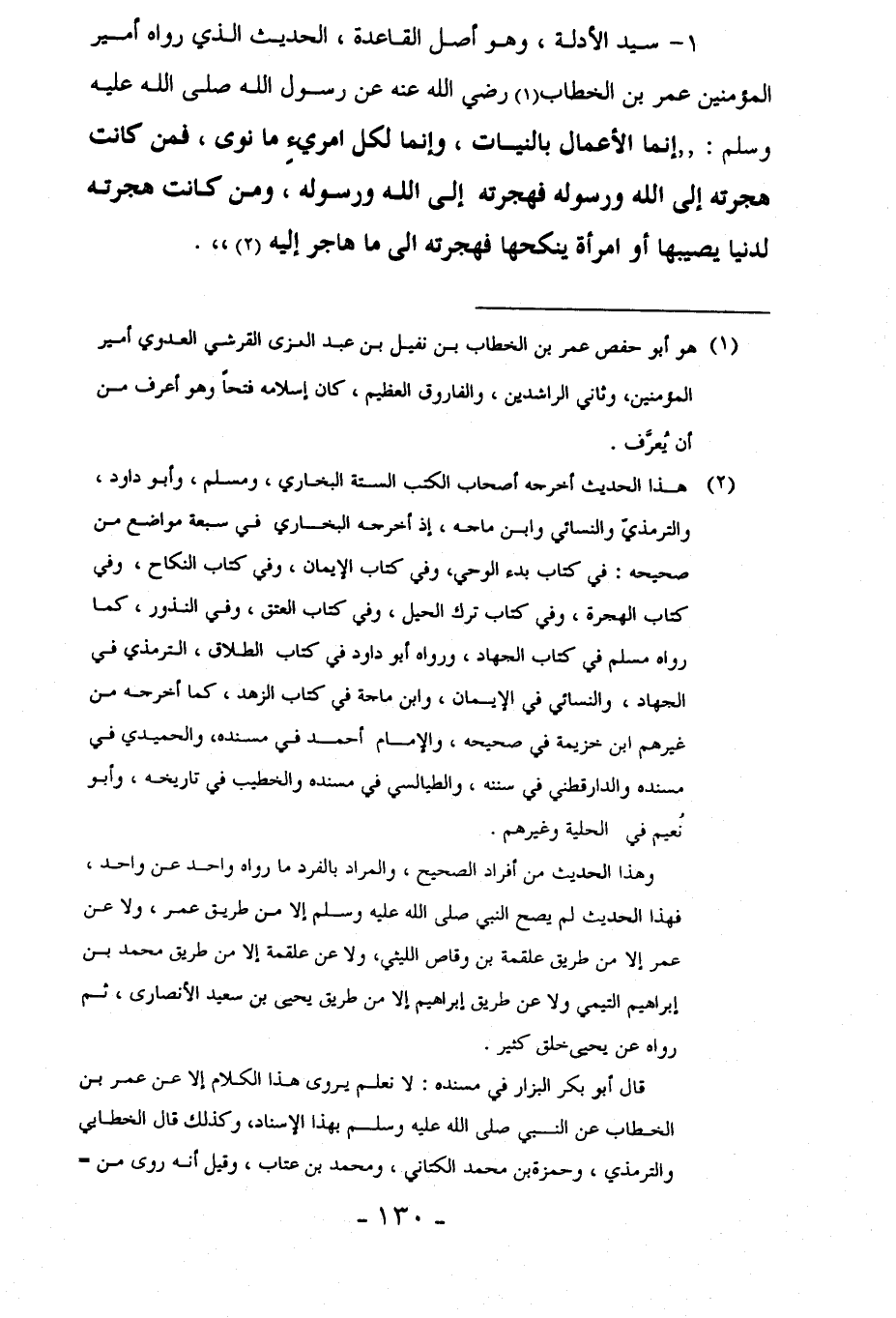 1 - سيد الأدلة، وهو أصل القاعدة، الحديث الذي رواه أمير المؤمنين عمر بن الخطاب (¬1) رضي الله عنه عن رسول الله صلى الله عليه وسلم: "إنما الأعمال بالنيات، وإنما لكل امريءٍ ما نوى، فمن كانت هجرته إلى الله ورسوله فهجرته إلى الله ورسوله، ومن كانت هجرته لدنيا يصيبها أو امرأة ينكحها فهجرته إلى ما هاجر إليه (¬2) ".