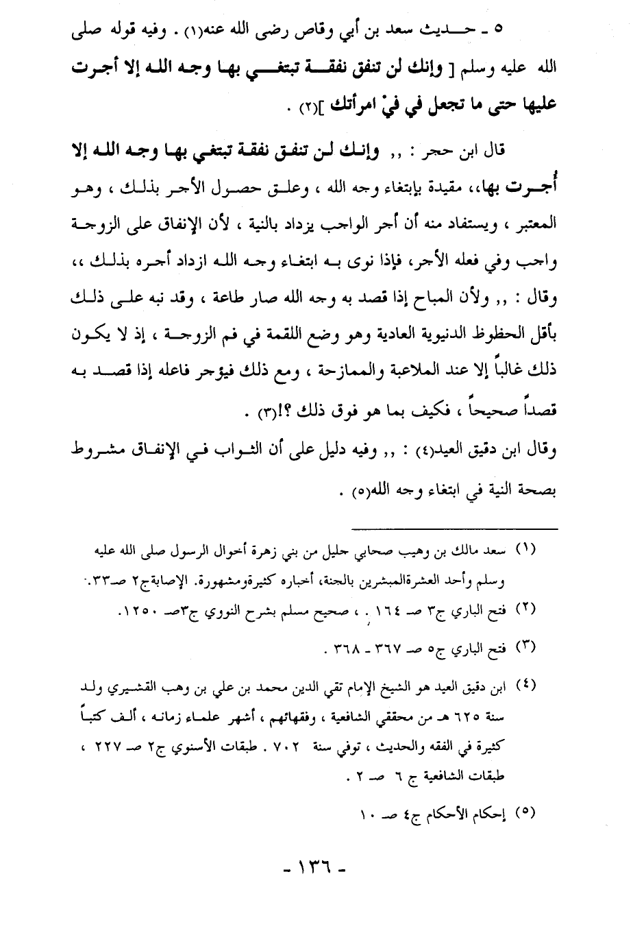 5 - حديث سعد بن أبي وقاص رضي الله عنه (¬1). وفيه قوله صلى الله عليه وسلم [وإنك لن تنفق نفقة تبتغي بها وجه الله إلا أجرت عليها حتى ما تجعل في فيْ امرأتك] (¬2).