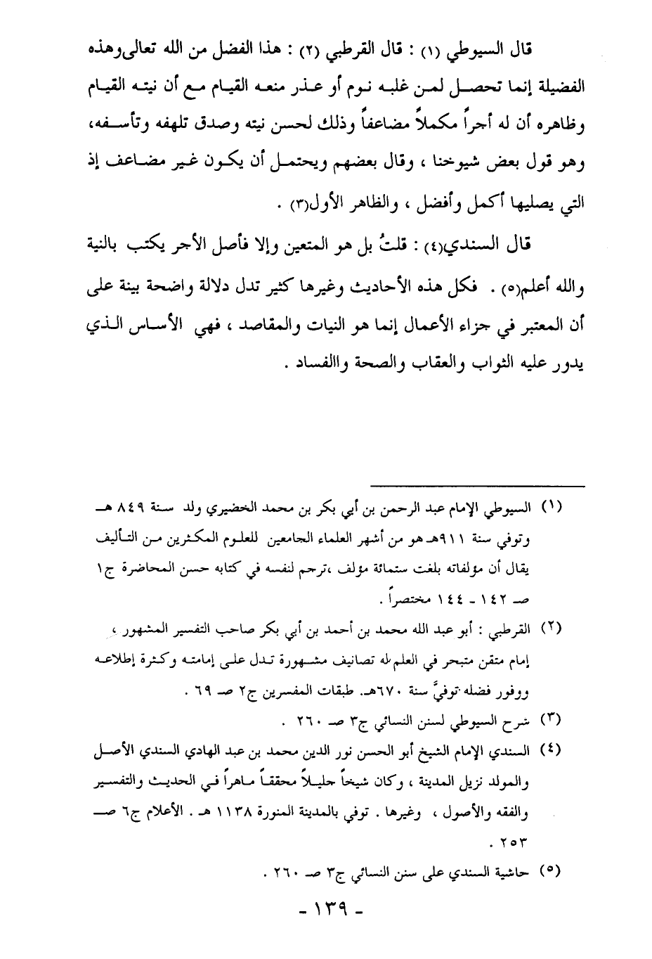 قال السيوطي (¬1): قال القرطبي (¬2): هذا الفضل من الله تعالى وهذه الفضيلة إنما تحصل لمن غلبه نوم أو عذر منعه القيام مع أن نيته القيام وظاهره أن له أجراً مكملاً مضاعفاً وذلك لحسن نيته وصدق تلهفه وتأسفه، وهو قول بعض شيوخنا، وقال بعضهم ويحتمل أن يكون غير مضاعف إذ التي يصليها أكمل وأفضل، والظاهر الأول (¬3).