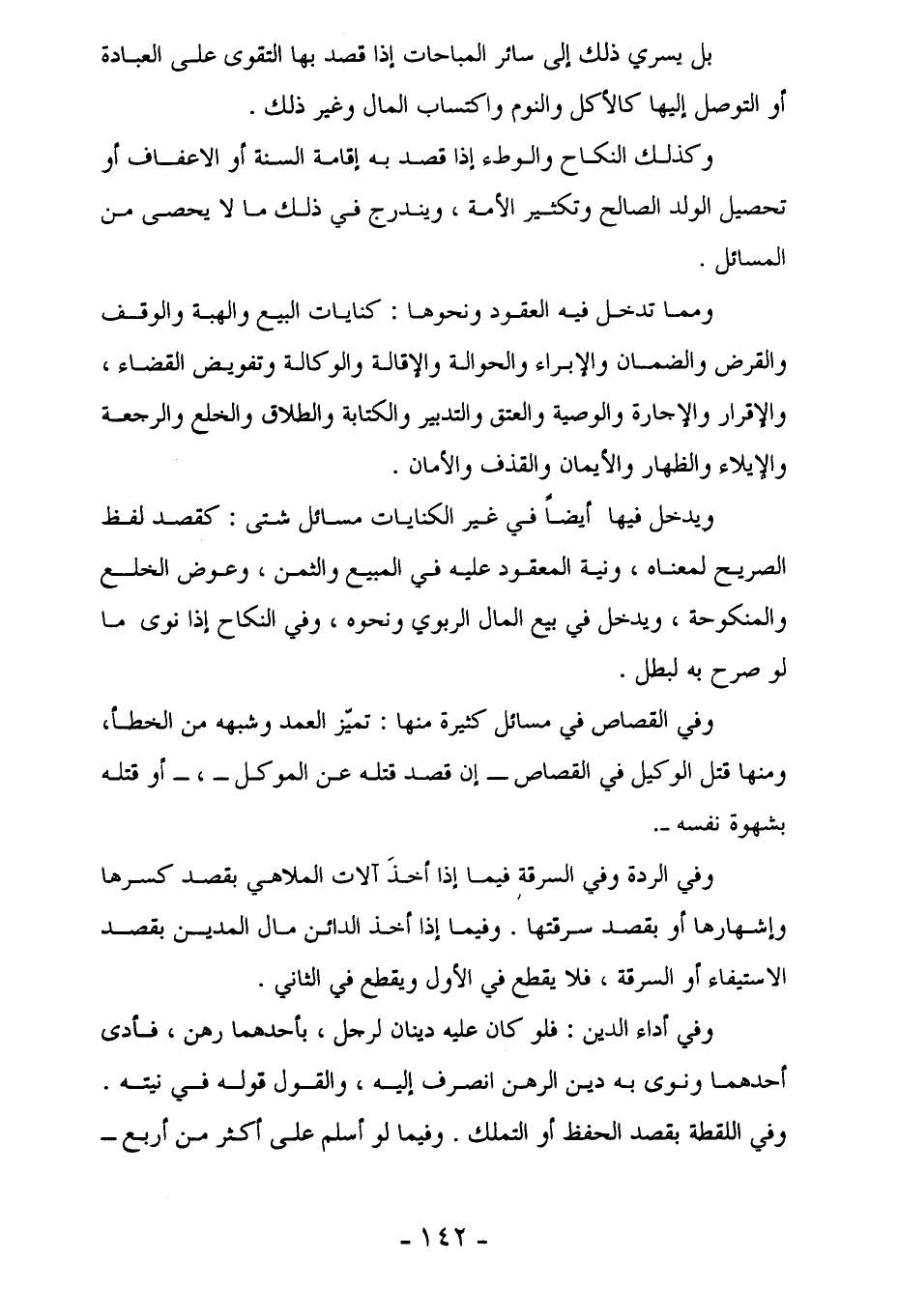 وفي الردة وفي السرقة فيما إذا أخذَ آلات الملاهي بقصد كسرها وإشهارها أو بقصد سرقتها. وفيما إذا أخذ الدائن مال المدين بقصد الاستيفاء أو السرقة، فلا يقطع في الأول ويقطع في الثاني.