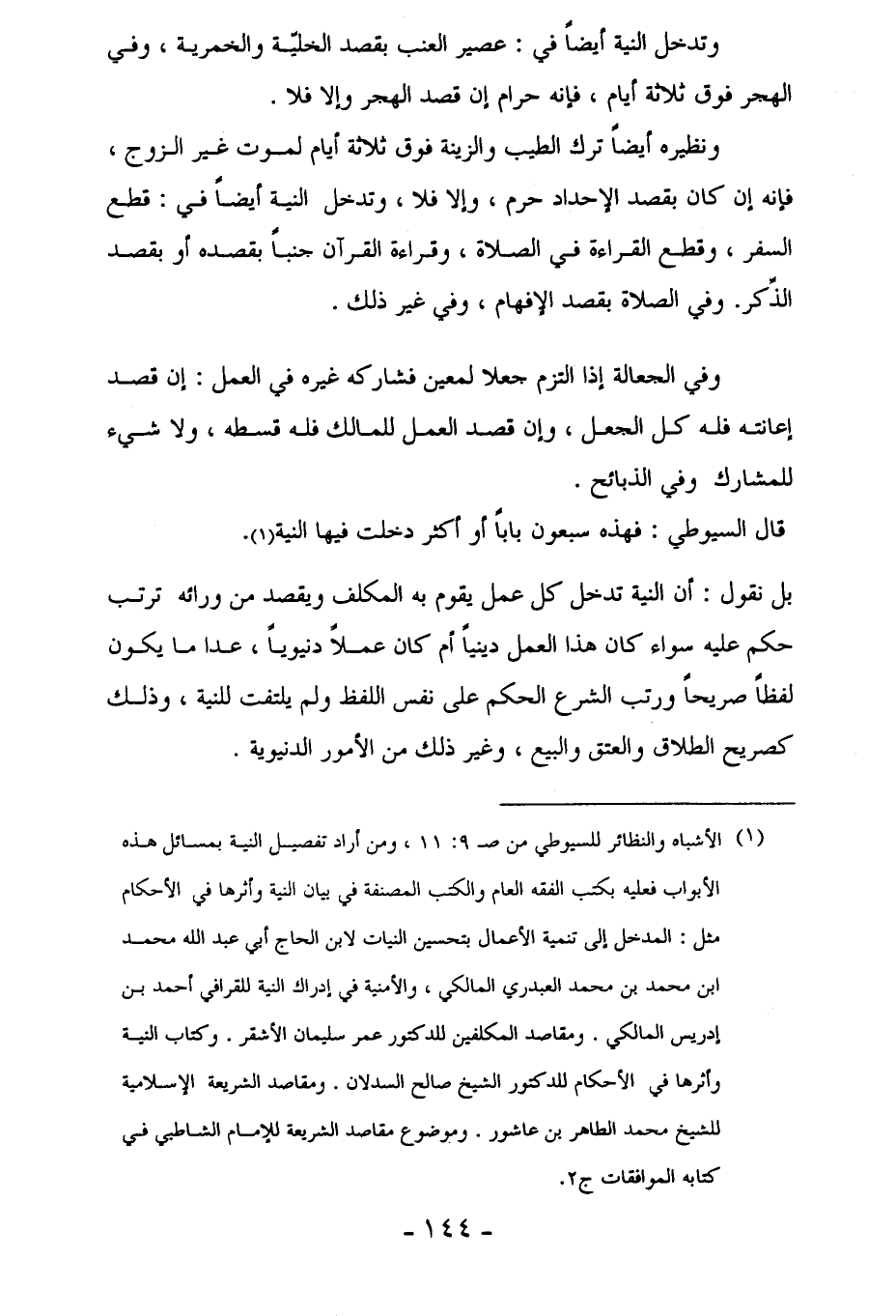(¬1) الأشباه والنظائر للسيوطي من صـ 9: 11، ومن أراد تفصيل النية بمسائل هذه الأبواب فعليه بكتب الفقه العام والكتب المصنفة في بيان النية وأثرها في الأحكام مثل: المدخل إلى تنمية الأعمال بتحسين النيات لابن الحاج أبي عبد الله محمد ابن محمد بن محمد العبدري المالكي، والأمنية في إدراك النية للقرافي أحمد بن إدريس المالكي. ومقاصد المكلفين للدكتور عمر سليمان الأشقر. وكتاب النية وأثرها في الأحكام للدكتور الشيخ صالح السدلان. ومقاصد الشريعة الإسلامية للشيخ محمد الطاهر بن عاشور. وموضوع مقاصد الشريعة للإمام الشاطبي في كتابه الموافقات ج 2.