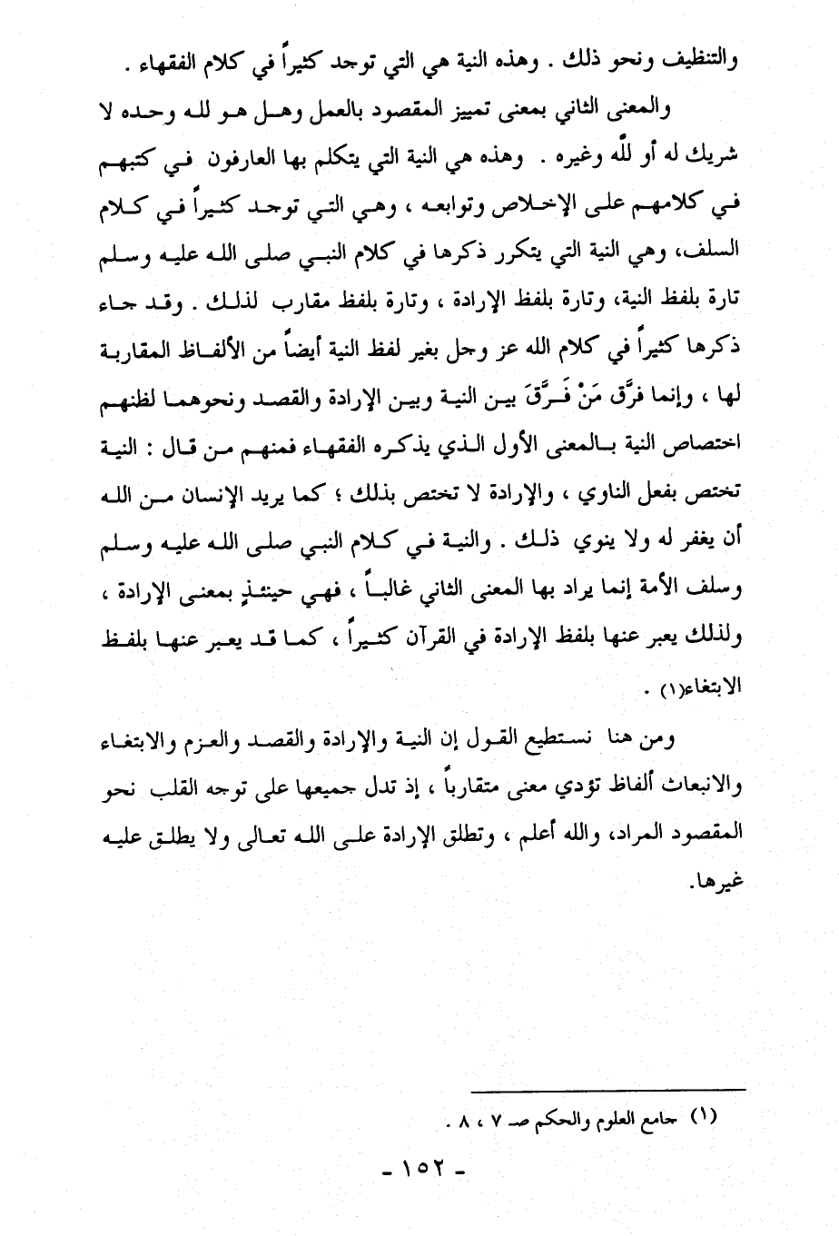 والمعنى الثاني بمعنى تمييز المقصود بالعمل وهل هو لله وحده لا شريك له أو لله وغيره. وهذه هي النية التي يتكلم بها العارفون في كتبهم في كلامهم على الإخلاص وتوابعه، وهي التي توجد كثيراً في كلام السلف، وهي النية التي يتكرر ذكرها في كلام النبي صلى الله عليه وسلم تارة بلفظ النية، وتارة بلفظ الإرادة، وتارة بلفظ مقارب لذلك. وقد جاء ذكرها كثيراً في كلام الله عز وجل بغير لفظ النية أيضاً من الألفاظ المقاربة لها، وإنما فرَّق مَنْ فَرَّقَ بين النية وبين الإرادة والقصد ونحوهما لظنهم اختصاص النية بالمعنى الأول الذي يذكره الفقهاء فمنهم من قال: النية تختص بفعل الناوي، والإرادة لا تختص بذلك؛ كما يريد الإنسان من الله أن يغفر له ولا ينوي ذلك. والنية في كلام النبي صلى الله عليه وسلم وسلف الأمة إنما يراد بها المعنى الثاني غالباً، فهي حينئذٍ بمعنى الإرادة، ولذلك يعبر عنها بلفظ الإرادة في القرآن كثيراً، كما قد يعبر عنها بلفظ الابتغاء (¬1).