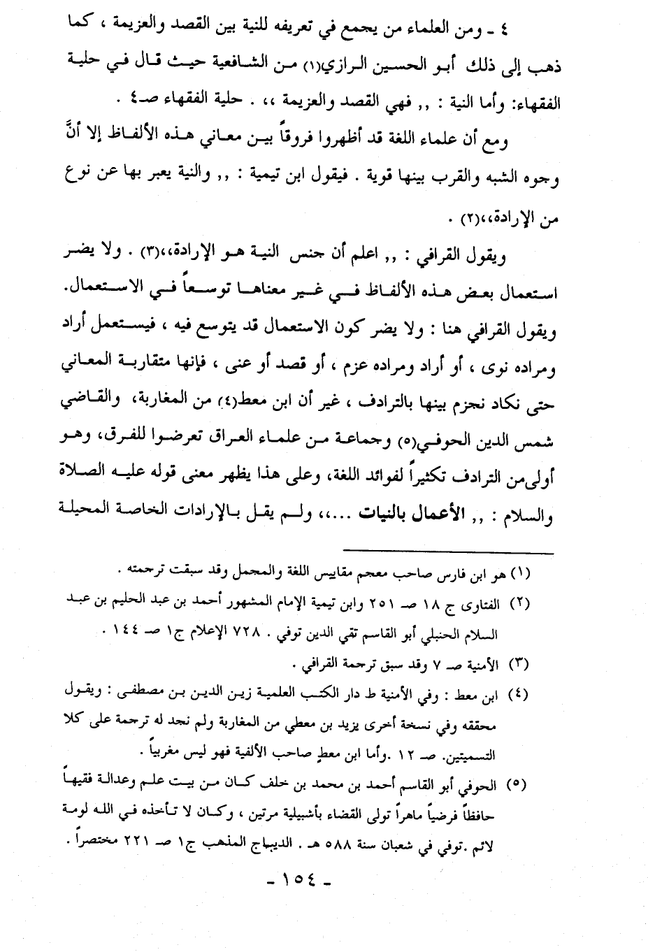 ويقول القرافي: "اعلم أن جنس النية هو الإرادة" (¬3). ولا يضر استعمال بعض هذه الألفاظ في غير معناها توسعاً في الاستعمال. ويقول القرافي هنا: ولا يضر كون الاستعمال قد يتوسع فيه، فيستعمل أراد ومراده نوى، أو أراد ومراده عزم، أو قصد أو عنى، فإنها متقاربة المعاني حتى نكاد نجزم بينها بالترادف، غير أن ابن معط (¬4) من المغاربة، والقاضي شمس الدين الحوفي (¬5) وجماعة من علماء العراق تعرضوا للفرق، وهو أولى من الترادف تكثيراً لفوائد اللغة، وعلى هذا يظهر معنى قوله عليه الصلاة والسلام: "الأعمال بالنيات ... " ولم يقل بالإرادات الخاصة المحيلة