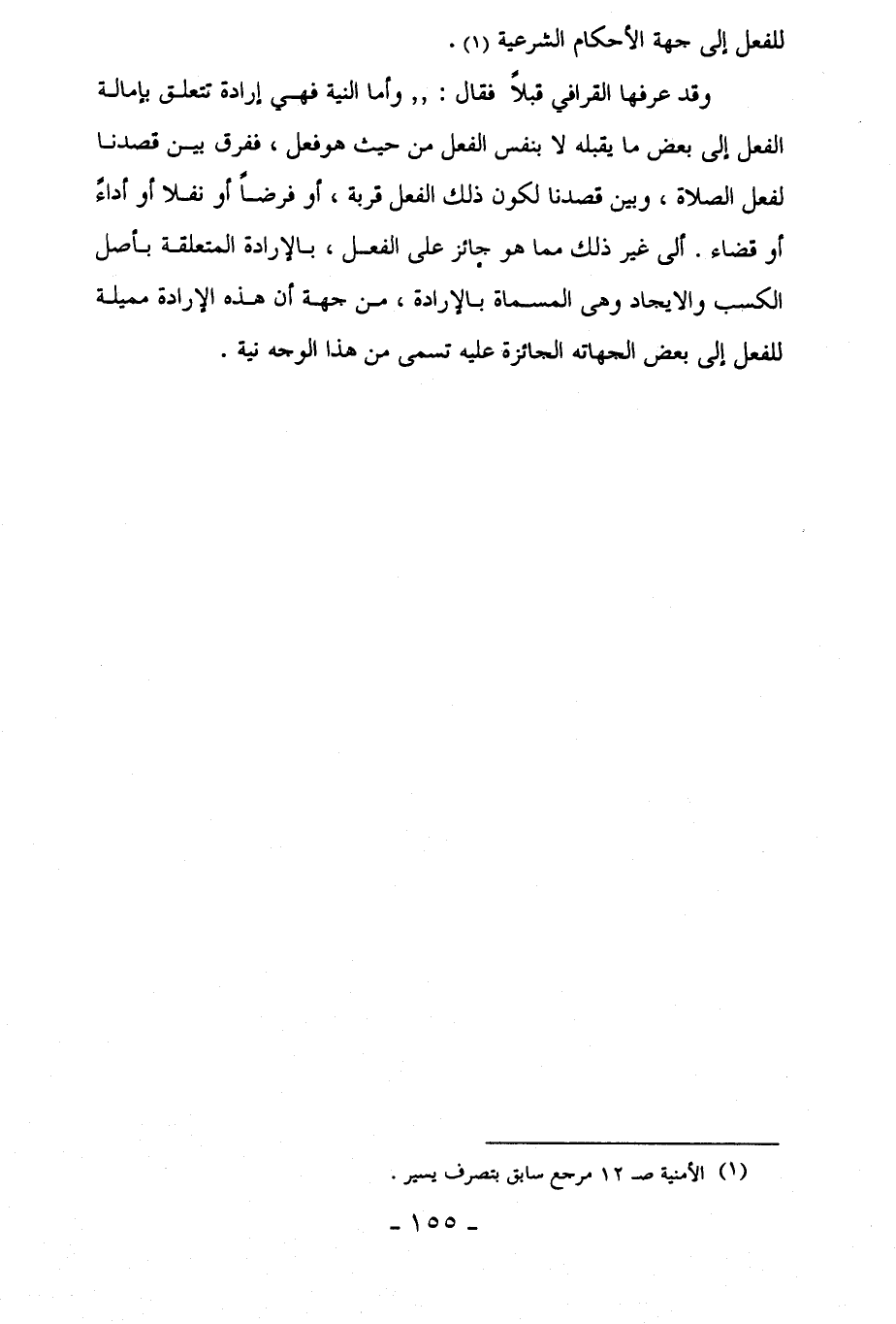 وقد عرفها القرافي قبلًا فقال: "وأما النية فهي إرادة تتعلق بإمالة الفعل إلى بعض ما يقبله لا بنفس الفعل من حيث هو فعل، ففرق بين قصدنا لفعل الصلاة، وبين قصدنا لكون ذلك الفعل قربة، أو فرضاً أو نفلا أو أداءً أو قضاء. إلى غير ذلك مما هو جائز على الفعل، بالإرادة المتعلقة بأصل الكسب والايجاد وهى المسماة بالإرادة، من جهة أن هذه الإرادة مميلة للفعل إلى بعض الجهات الجائزة عليه تسمى من هذا الوجه نية.