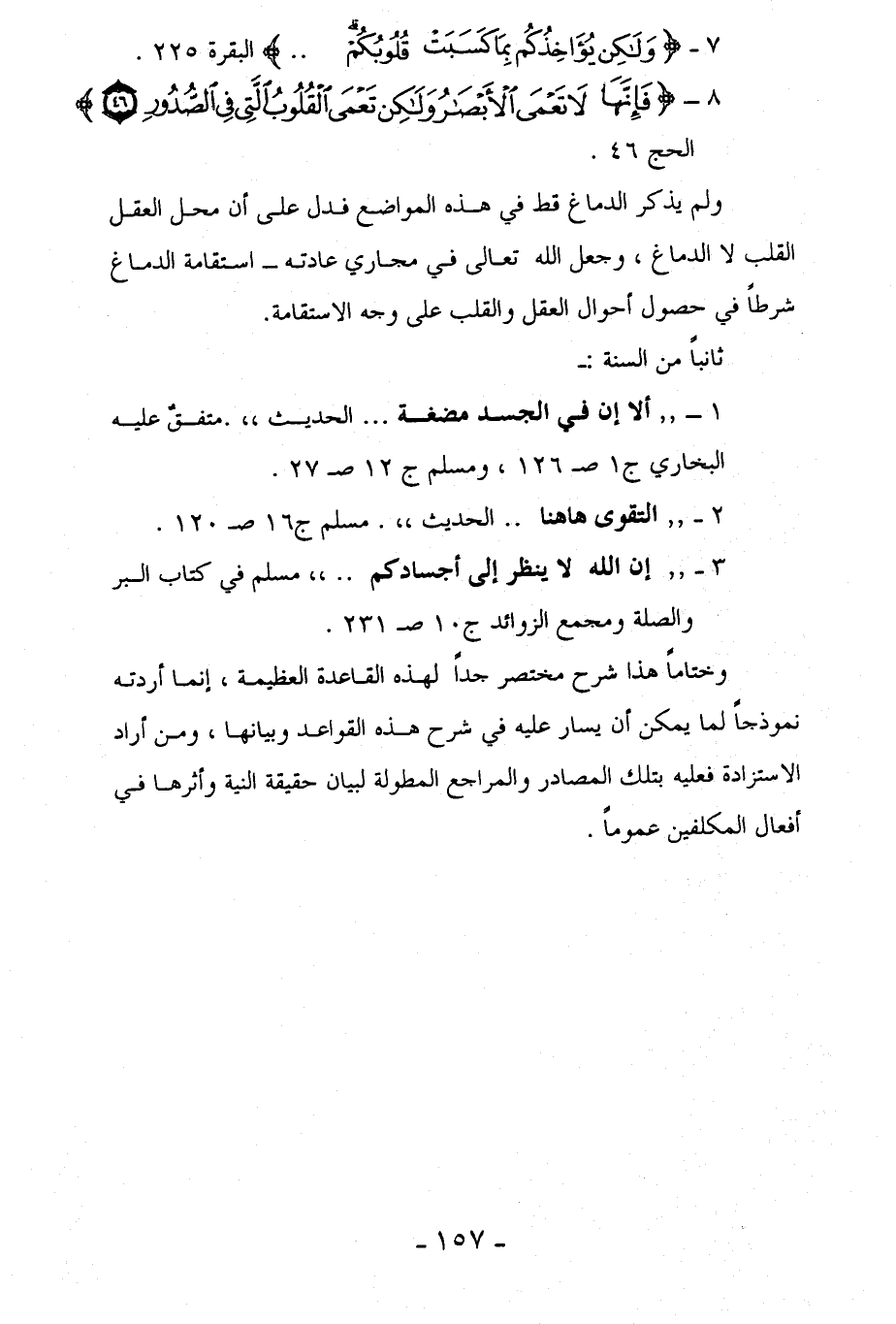 1 - " ألا إن في الجسد مضغة ... الحديث". متفقٌ عليه البخاري ج 1 صـ 126، ومسلم ج 12 صـ 27.