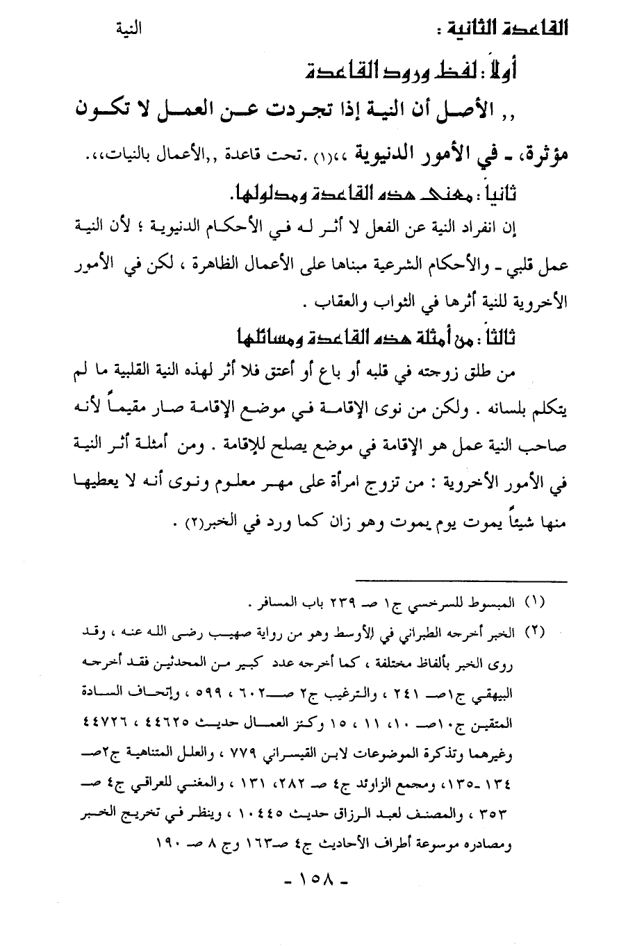 من طلق زوجته في قلبه أو باع أو أعتق فلا أثر لهذه النية القلبية ما لم يتكلم بلسانه. ولكن من نوى الإقامة في موضع الإقامة صار مقيماً لأنه صاحب النية عمل هو الإقامة في موضع يصلح للإقامة. ومن أمثلة أثر النية في الأمور الأخروية: من تزوج امرأة على مهر معلوم ونوى أنه لا يعطيها منها شيئاً يموت يوم يموت وهو زان كما ورد في الخبر (¬2).