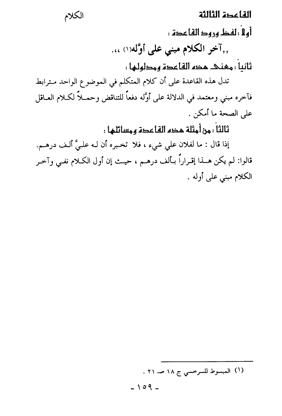 تدل هذه القاعدة على أن كلام المتكلم في الموضوع الواحد مترابط فآخره مبني ومعتمد في الدلالة على أوَّله دفعاً للتناقض وحملاً لكلام العاقل على الصحة ما أمكن.