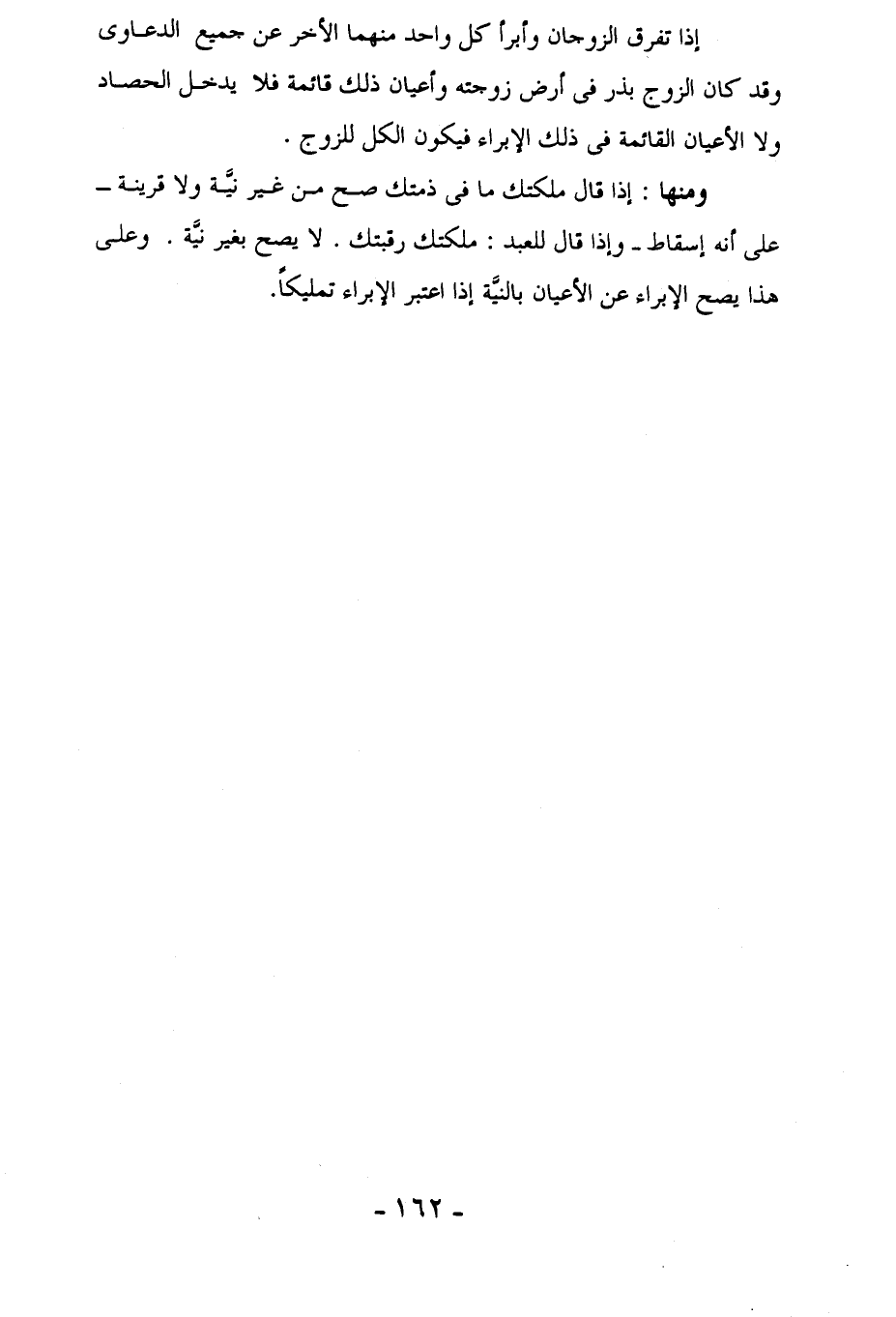 ومنها: إذا قال ملكتك ما في ذمتك صح من غير نيَّة ولا قرينة - على أنه إسقاط - وإذا قال للعبد: ملكتك رقبتك. لا يصح بغير نيَّة. وعلى هذا يصح الإبراء عن الأعيان بالنيَّة إذا اعتبر الإبراء تمليكاً.