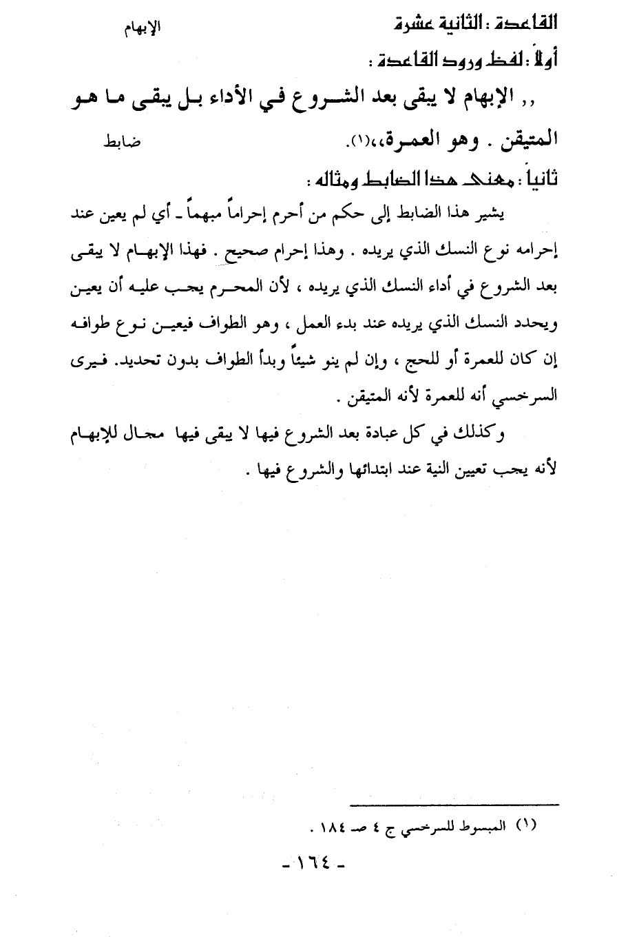 يشير هذا الضابط إلى حكم من أحرم إحراماً مبهماً - أي لم يعين عند إحرامه نوع النسك الذي يريده. وهذا إحرام صحيح. فهذا الإبهام لا يبقى بعد الشروع في أداء النسك الذي يريده، لأن المحرم يجب عليه أن يعين ويحدد النسك الذي يريده عند بدء العمل، وهو الطواف فيعين نوع طوافه إن كان للعمرة أو للحج، وإن لم ينو شيئاً وبدأ الطواف بدون تحديد. فيرى السرخسي أنه للعمرة لأنه المتيقن.