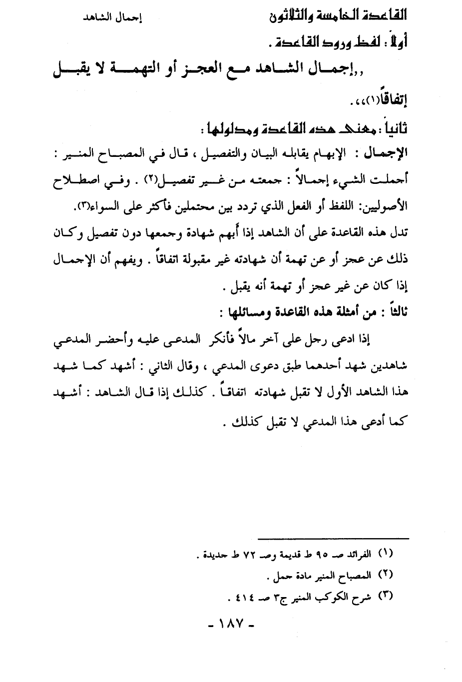 " إجمال الشاهد مع العجز أو التهمة لا يقبل إتفاقاً (¬1) ".