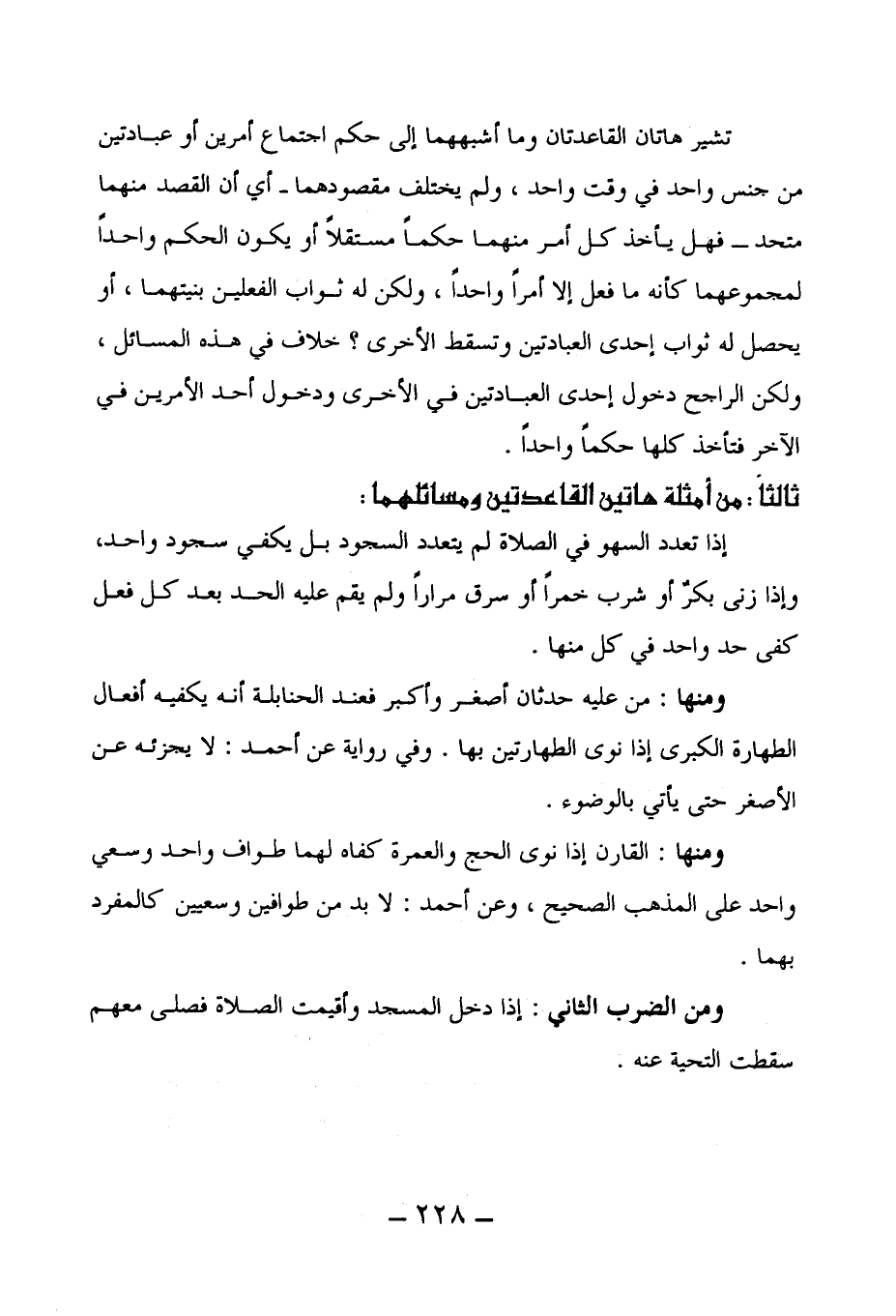 تشير هاتان القاعدتان وما اشبههما إلى حكم اجتماع أمرين أو عبادتين من جنس واحد في وقت واحد، ولم يختلف مقصودهما - أي أن القصد منهما متحد - فهل يأخذ كل أمر منهما حكماً مستقلاً أو يكون الحكم واحداً لمجموعهما كأنه ما فعل إلا أمراً واحداً، ولكن له ثواب الفعلين بنيتهما، أو يحصل له ثواب إحدى العبادتين وتسقط الأخرى؟ خلاف في هذه المسائل، ولكن الراجح دخول إحدى العبادتين في الأخرى ودخول أحد الأمرين في الآخر فتأخذ كلها حكماً واحداً.