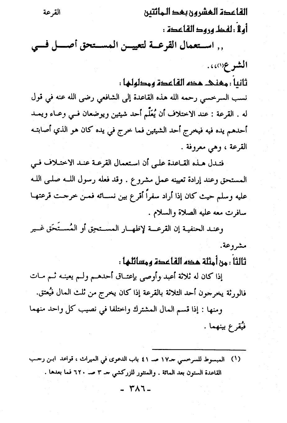 نسب السرخسي رحمه الله هذه القاعدة إلى الشافعي رضي الله عنه في قول له. القرعة: عند الاختلاف أن يُعَلَّم أحد شيئين ويوضعان في وعاء ويمد أحدهم يده فيه فيخرج أحد الشيئين فما خرج في يده كان هو الذي أصابته القرعة، وهي معروفة.