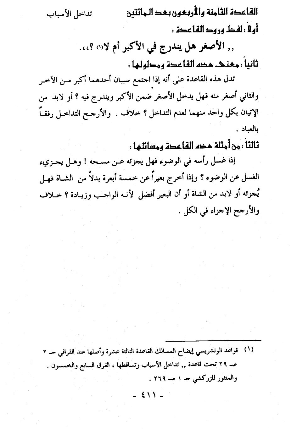 (¬1) قواعد الونشريسي إيضاح المسالك القاعدة الثالثة عشرة وأصلها عند القرافي جـ 2 صـ 29 تحت قاعدة "تداخل الأسباب وتساقطها، الفرق السابع والخمسون. والمنثور للزركشي جـ 1 صـ 269.