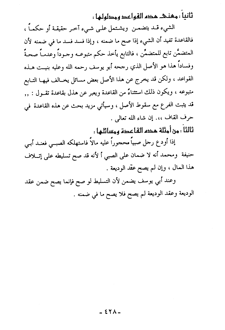 الشيء قد يتضمن ويشتمل على شيء آخر حقيقة أو حكماً، فالقاعدة تفيد أن الشيء إذا صح ما ضمنه، وإذا فسد فسد ما في ضمنه لأن المتضمَّن تابع للمتضمَّن، فالتابع يأخذ حكم متبوعه وجوداً وعدماً صحةً وفساداً هذا هو الأصل الذي رجحه أبو يوسف رحمه الله وعليه بنيت هذه القواعد، ولكن قد يخرج عن هذا الأصل بعض مسائل يخالف فيها التابع متبوعه، ويكون ذلك استثناءً من القاعدة ويعبر عن هذل بقاعدة تقول: " قد يثبت الفرع مع سقوط الأصل، وسيأتي مزيد بحث عن هذه القاعدة في حرف القاف". إن شاء الله تعالى.