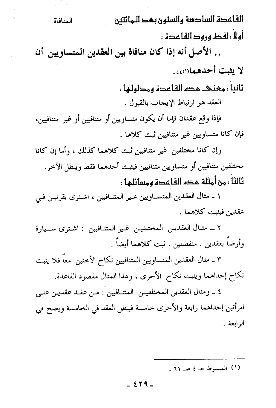 3 - مثال العقدين المتساويين المتنافيين نكاح الأختين معاً فلا يثبت نكاح إحداهما ويثبت نكاح الأخرى، وهذا المثال مقصود القاعدة.