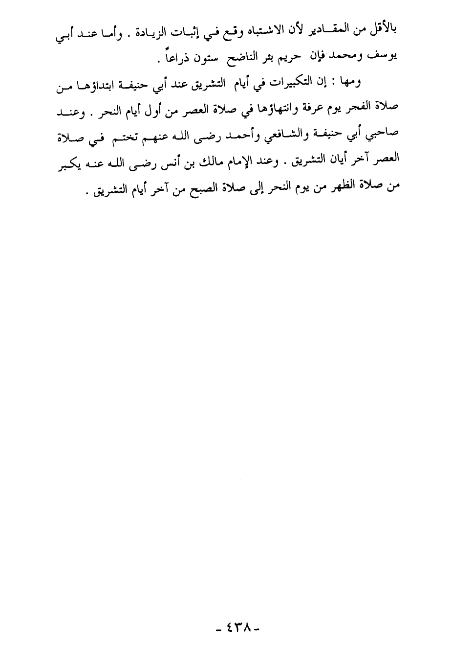 ومنها: إن التكبيرات في أيام التشريق عند أبي حنيفة ابتداؤها من صلاة الفجر يوم عرفة وانتهاؤها في صلاة العصر من أول أيام النحر. وعند صاحبي أبي حنيفة والشافعي وأحمد رضي الله عنهم تختم في صلاة العصر آخر أيام التشريق. وعند الإمام مالك بن أنس رضي الله عنه يكبر من صلاة الظهر من يوم النحر إلى صلاة الصبح من آخر أيام التشريق.