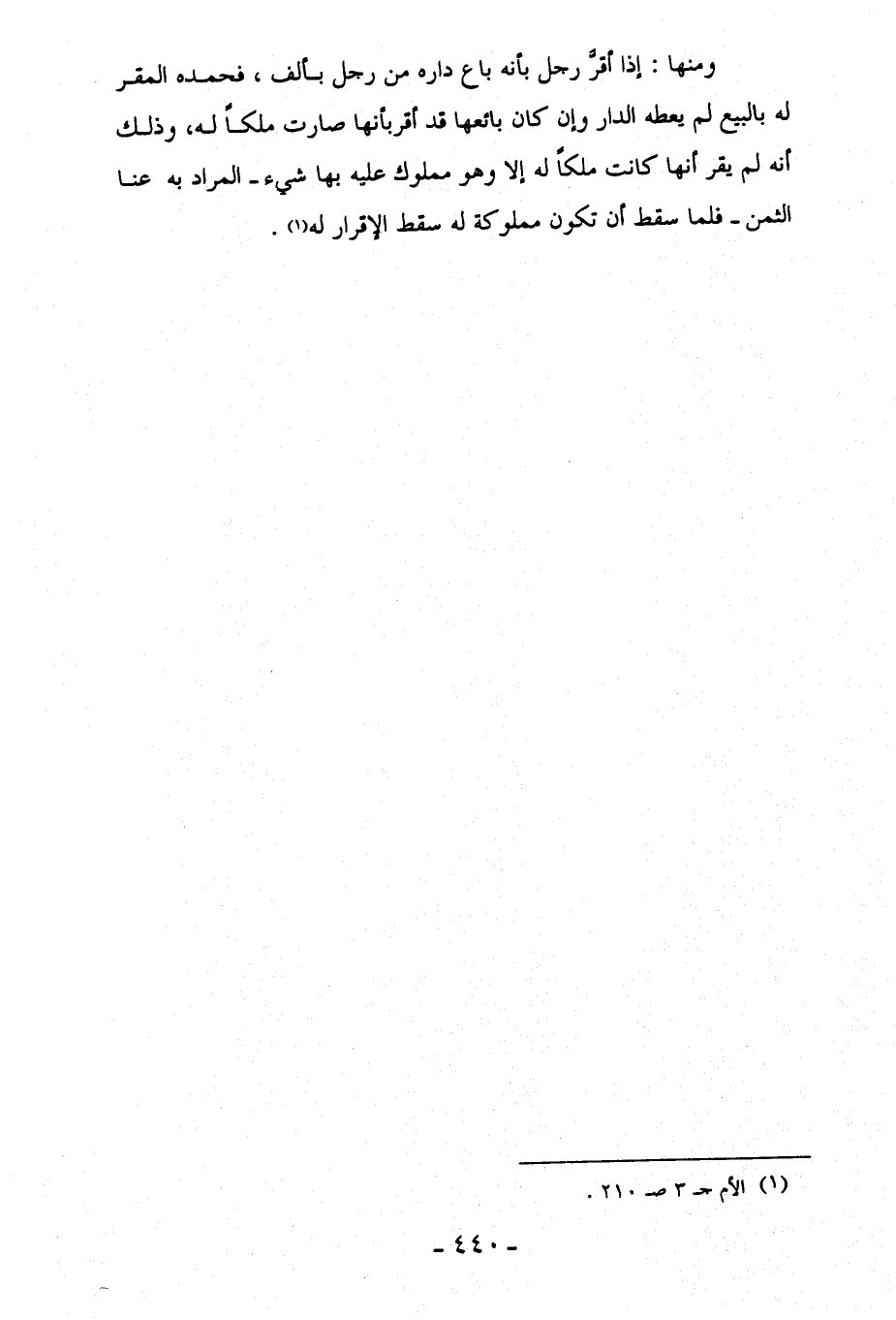 ومنها: إذا أقرَّ رجل بأنه باع داره من رجل بألف، فحمده المقر له بالبيع لم يعطه الدار وإن كان بائعها قد أقر بأنها صارت ملكاً له، وذلك أنه لم يقر أنها كانت ملكاً له إلا وهو مملوك عليه بها شيء - المراد به عنا الثمن - فلما سقط أن تكون مملوكة له سقط الإقرار له (¬1).