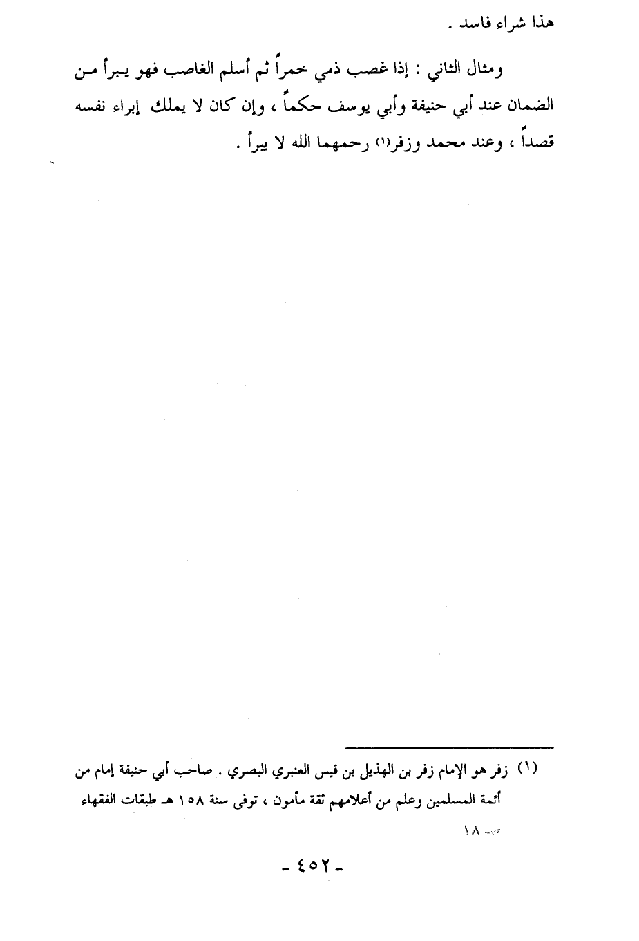 (¬1) زفر هو الإمام زفر بن الهذيل بن قيس العنبري البصري. صاحب أبي حنيفة إمام من أئمة المسلمين وعلم من أعلامهم ثقة مأمون، توفى سنة 158 هـ طبقات الفقهاء 18