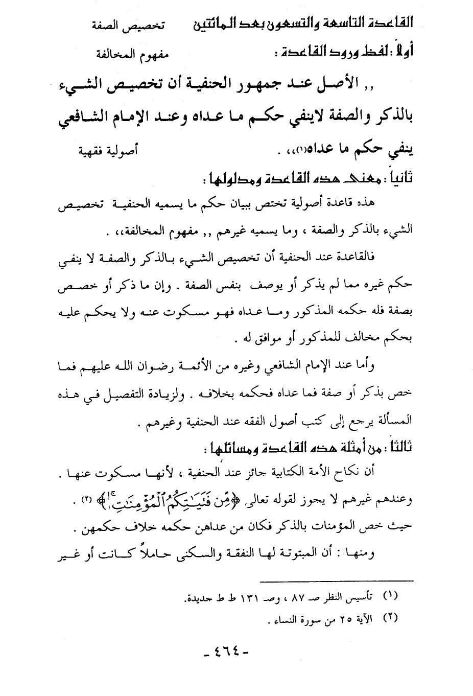 القاعدة التاسعة والتسعون بعد المائتين [تخصيص الصفة - مفهوم المخالفة]