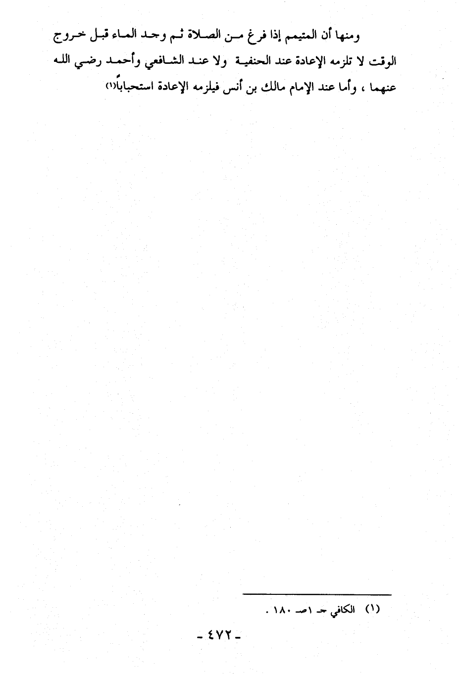 ومنها أن المتيمم إذا فرغ من الصلاة ثم وجد الماء قبل خروج الوقت لا تلزمه الإعادة عند الحنفية ولا عند الشافعي وأحمد رضي الله عنهما، وأما عند الإمام مالك بن أنس فيلزمه الإعادة استحباباً (¬1)