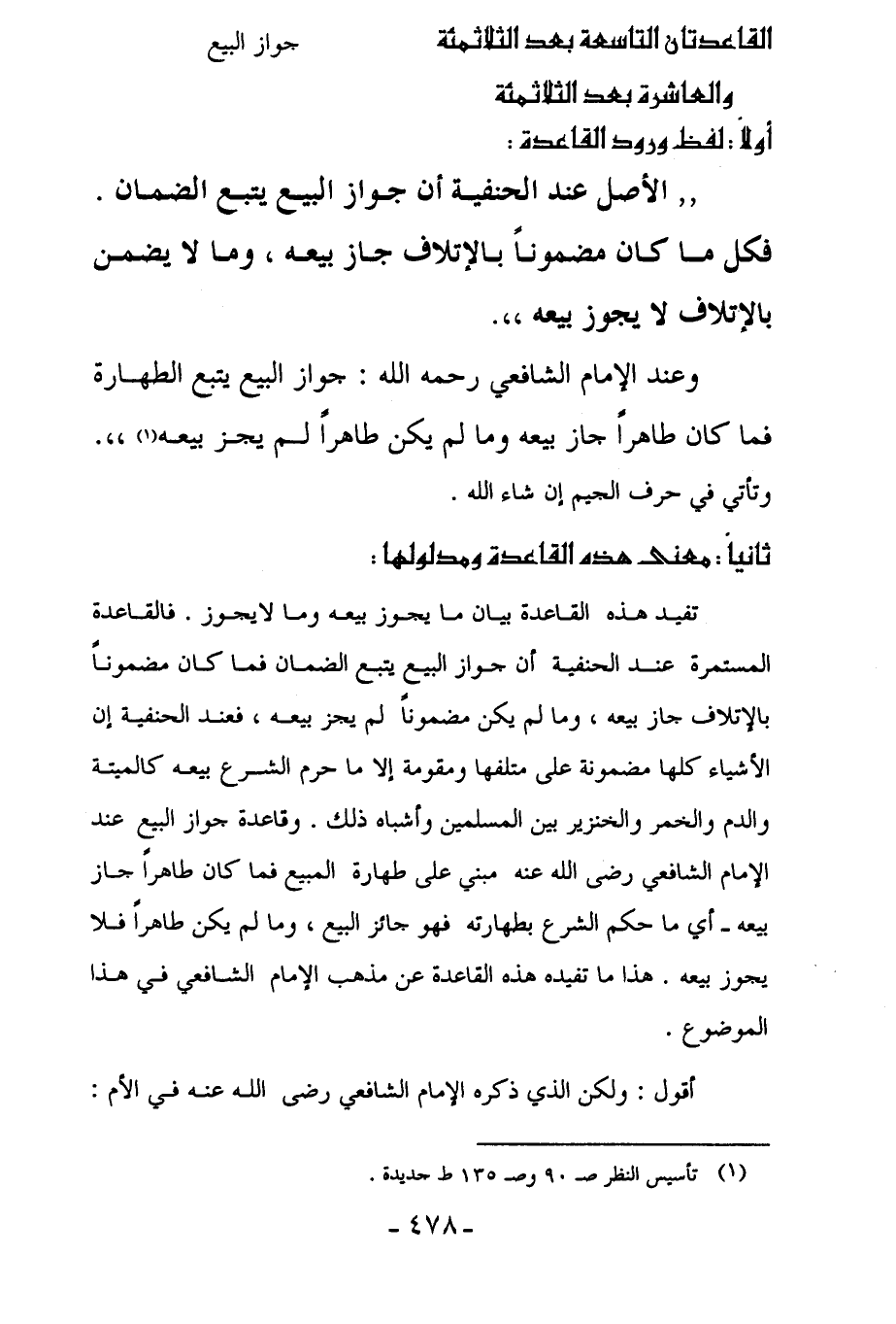 تفيد هذه القاعدة بيان ما يجوز بيعه وما لا يجوز. فالقاعدة المستمرة عند الحنفية أن جواز البيع يتبع الضمان فما كان مضموناً بالإتلاف جاز بيعه، وما لم يكن مضموناً لم يجز بيعه، فعند الحنفية إن الأشياء كلها مضمونة على متلفها ومقومة إلا ما حرم الشرع بيعه كالميتة والدم والخمر والخنزير بين المسلمين وأشباه ذلك. وقاعدة جواز البيع عند الإمام الشافعي رضي الله عنه مبني على طهارة المبيع فما كان طاهراً جاز بيعه - أي ما حكم الشرع بطهارته فهو جائز البيع، وما لم يكن طاهراً فلا يجوز بيعه. هذا ما تفيده هذه القاعدة عن مذهب الإمام الشافعي في هذا الموضوع.