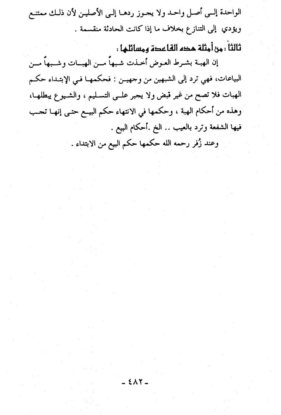 إن الهبة بشرط العوض أخذت شبهاً من الهبات وشبهاً من البياعات، فهي ترد إلي الشبهين من وجهين: فحكمها في الابتداء حكم الهبات فلا تصح من غير قبض ولا يجبر على التسليم، والشيوع يبطلها، وهذه من أحكام الهبة، وحكمها في الانتهاء حكم البيع حتى إنها تجب فيها الشفعة وترد بالعيب .. إلخ. أحكام البيع.