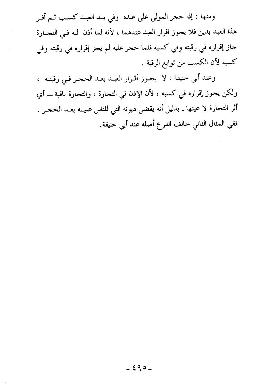 وعند أبي حنيفة: لا يجوز إقرار العبد بعد الحجر في رقبته، ولكن يجوز إقراره في كسبه, لأن الإذن في التجارة، والتجارة باقية - أي أثر التجارة لا عينها - بدليل أنه يقضى ديونه التي للناس عليه بعد الحجر. ففي المثال الثاني خالف الفرع أصله عند أبي حنيفة.