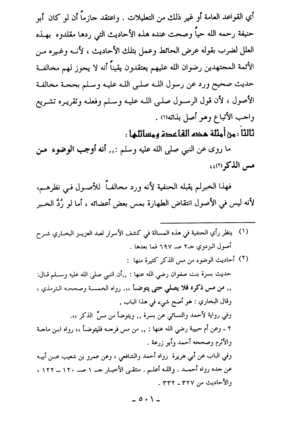 حديث بسرة بنت صفوان رضي الله عنها: "أن النبي صلى الله عليه وسلم قال: "من مس ذكره فلا يصلي حتى يتوضأ". رواه الخمسة وصححه الترمذي, وقال البخاري: هو أصح شيء في هذا الباب.