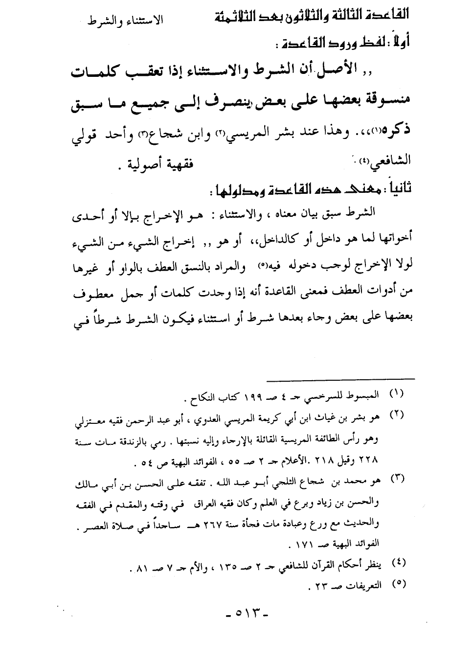 " الأصل أن الشرط والاستثناء إذا تعقب كلمات منسوقة بعضها على بعض ينصرف إلى جميع ما سبق ذكره (¬1) ". وهذا عند بشر المريسي (¬2) وابن شجاع (¬3) وأحد قولي الشافعي (¬4). [فقهية أصولية].