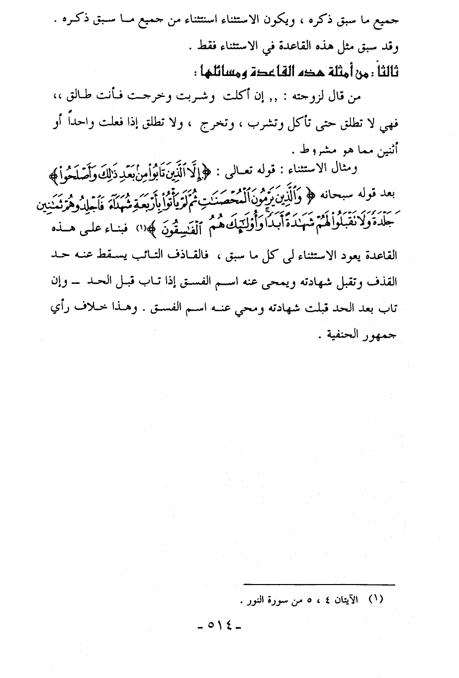 ومثال الاستثناء: قوله تعالى: {إِلَّا الَّذِينَ تَابُوا وَأَصْلَحُوا} بعد قوله سبحانه {وَالَّذِينَ يَرْمُونَ الْمُحْصَنَاتِ ثُمَّ لَمْ يَأْتُوا بِأَرْبَعَةِ شُهَدَاءَ فَاجْلِدُوهُمْ ثَمَانِينَ جَلْدَةً وَلَا تَقْبَلُوا لَهُمْ شَهَادَةً أَبَدًا وَأُولَئِكَ هُمُ الْفَاسِقُونَ} (¬1) فبناء على هذه القاعدة يعود الاستثناء لي كل ما سبق، فالقاذف التائب يسقط عنه حد القذف وتقبل شهادته ويمحى عنه اسم الفسق إذا تاب قبل الحد - وإن تاب بعد الحد قبلت شهادته ومحي عنه اسم الفسق. وهذا خلاف رأي جمهور الحنفية.